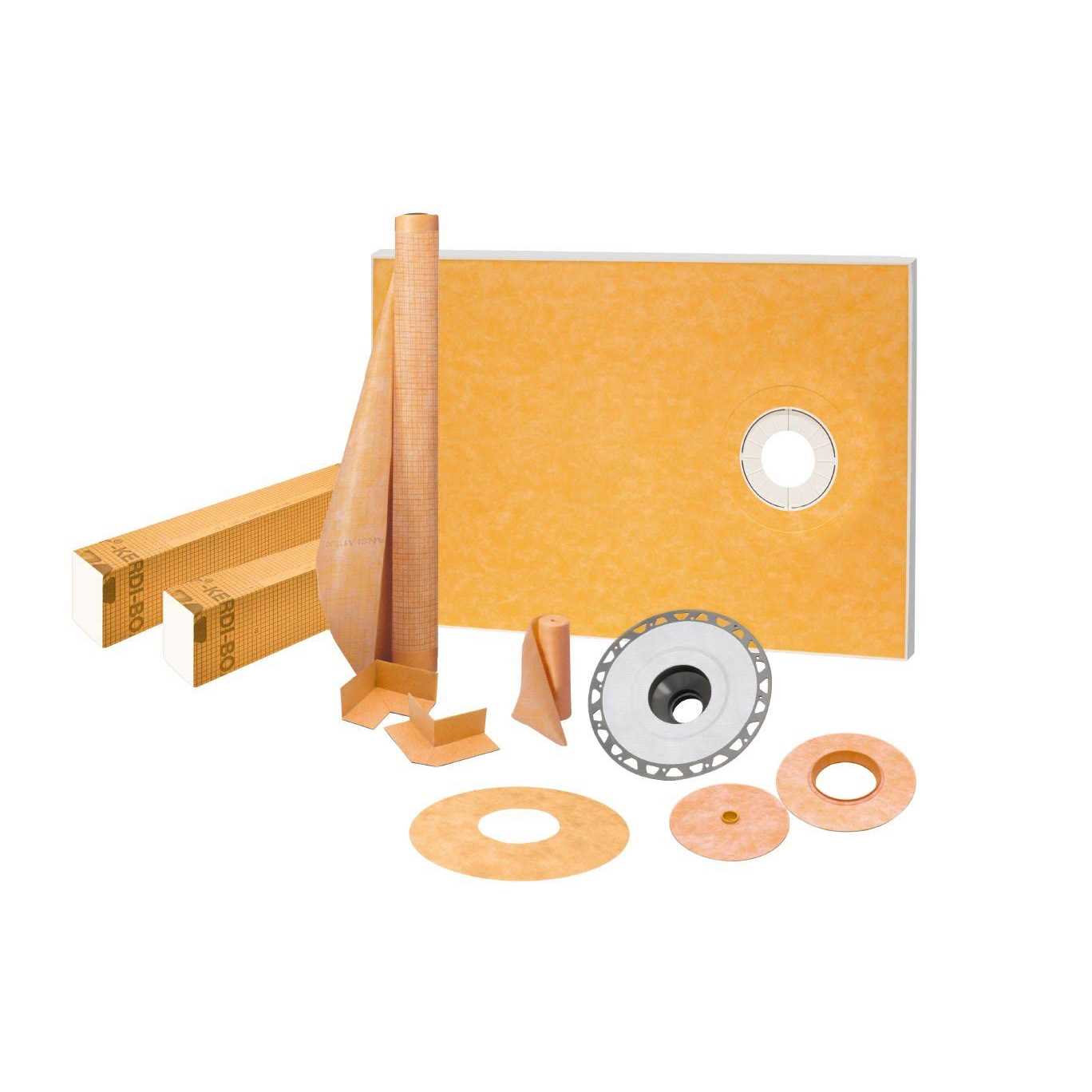 The Kerdi-Shower-Kit without the drain is a kit containing components to create a watertight shower assembly. The prefabricated sloped shower tray with integrated Kerdi waterproofing eliminates the need for a mortar bed. Kit includes a shower tray, Kerdi-Board-SC shower curb, Kerdi waterproofing membrane, Kerdi-Band waterproofing strip, Kerdi-Kereck corners, Kerdi-Seal pipe seal and mixing valve seal. The Kerdi-Shower-Kit without the drain is designed for use with the Kerdi-Drain flange and the Kerdi-Drain grate which are sold separate.