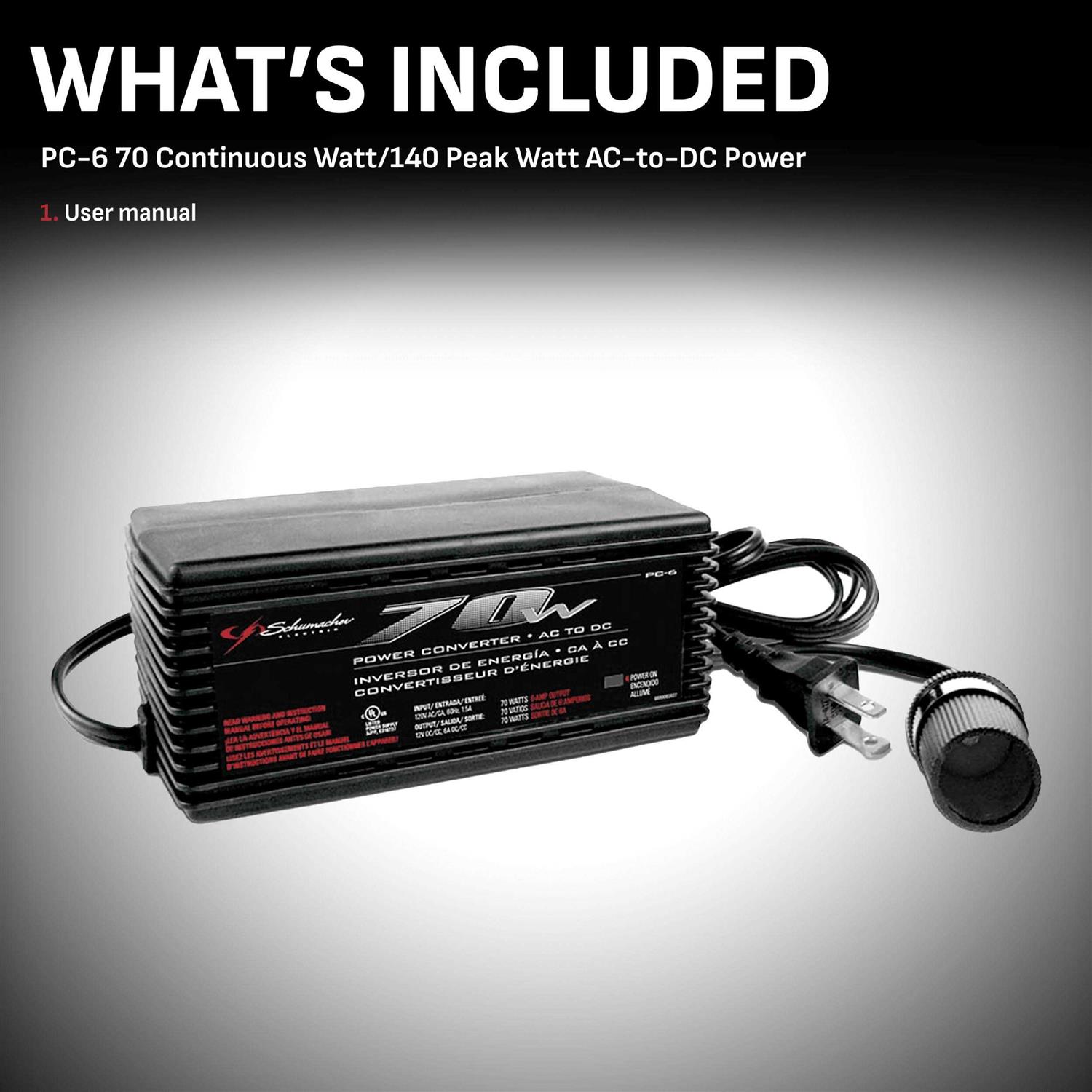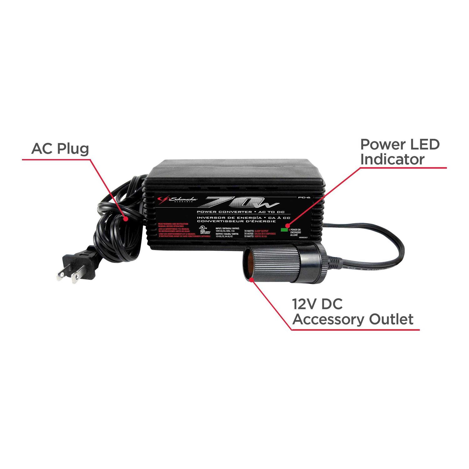 Have you ever needed to charge your phone, but could only find a car charger? Perhaps you have a 12V device that you bought for a tailgate but love enough to use at home. If either of these describes you, youll want to own the Schumacher 70 Continuous Watt/140 Peak Watt AC-to-DC Power Inverter (PC-6). Most inverters on the market convert your vehicles DC power into 120V AC household power. The PC-6 does the opposite, safely converting your household power to 12V DC. Easy to use, the PC-6 features plug-and-play operation. Plug the inverter into any 120V AC outlet and the green Power On LED indicator will illuminate. Then simply insert your devices 12V accessory plug into the inverters 12V DC socket.