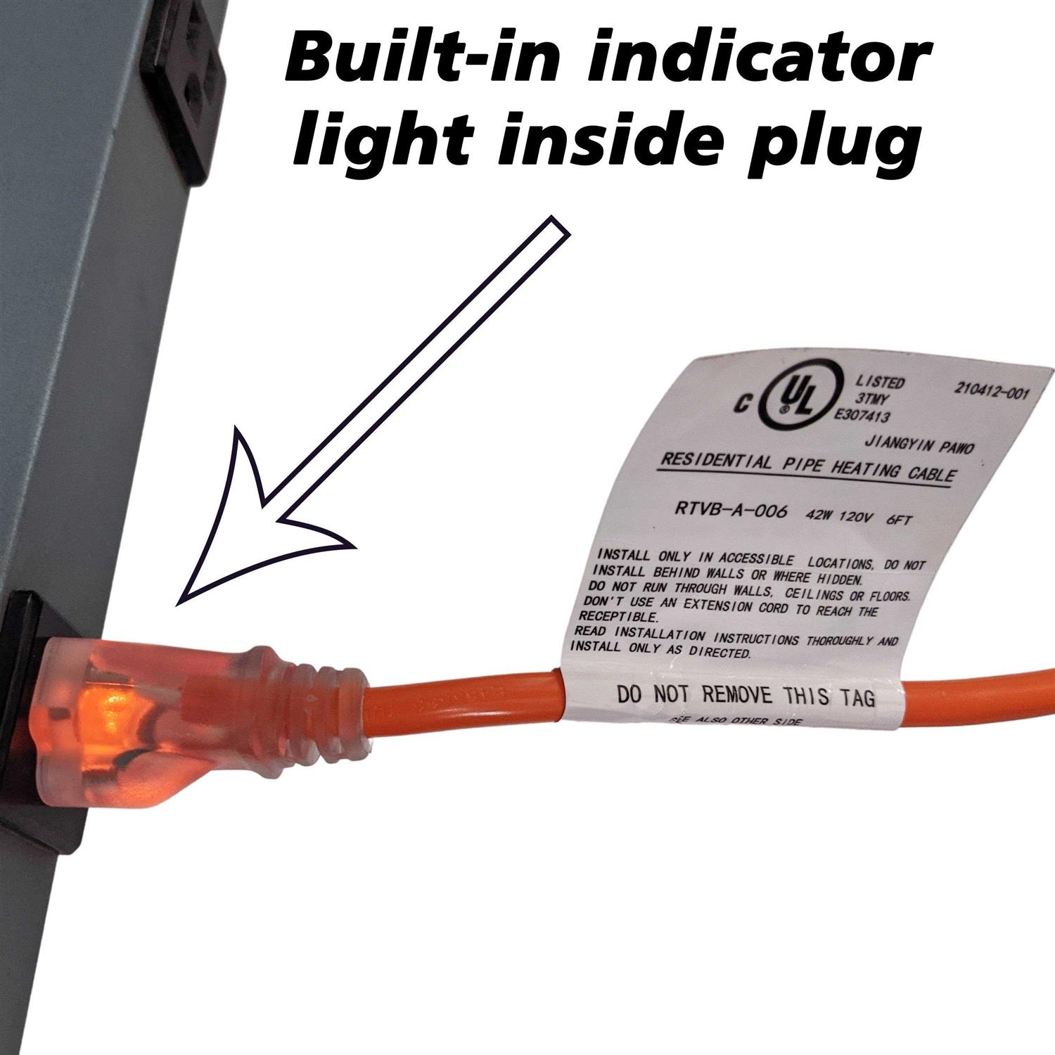 30 ft. water pipe heating cable, 210 watt, black color Stops metal and rigid plastic pipes from freezing down to -40°F — built-in thermostat automatically turns heating on when pipe temperature is below 42.8° F (close to freezing) and turns heating off once pipe is warmed to 55.4° F (well above freezing) A single 30 foot heating cable is suitable for 30 foot long pipes that are 3/8 inches to 3/4 inches in diameter, or for 30 foot long pipes that are 1 to 1-1/2″ in diameter. NOTE: Use only for water filled plastic (including PEX) or metal pipes. Not for use with anything else, like empty water pipes, fuel lines, hoses, gutters, steam lines, and so on. Features grounded plug with indicator light Pre-assembled, easy to install using the included instructions. Materials required (not included) are: aluminum foil (recommended for plastic pipe), fiberglass plumbing pipe insulation, fiberglass tape or similar with temperature rating 175° F or higher. 30 foot water pipe freeze protection heating cable. Stops metal and rigid plastic pipes from freezing down to -40°F — built-in thermostat automatically turns heating on when pipe temperature is below 42.8° F (close to freezing) and turns heating off once pipe is warmed to 55.4° F (well above freezing). A single 30 foot heating cable is suitable for 30 foot long pipes that are 3/8 inches to 3/4 inches in diameter, or for 30 foot long pipes that are 1 to 1-1/2″ in diameter. br / br / NOTE: Use only for water filled plastic (including PEX) or metal pipes. Not for use with anything else, like empty water pipes, fuel lines, hoses, gutters, steam lines, and so on. Pre-assembled, easy to install using the included instructions. br / br / Materials required (not included) are: aluminum foil (recommended for plastic pipe), fiberglass plumbing pipe insulation, fiberglass tape or similar with temperature rating 175° F or higher.