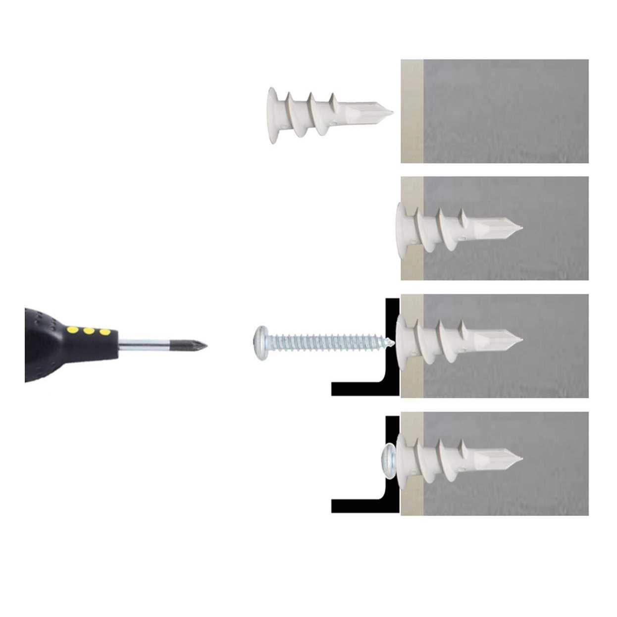 The self-drilling drywall anchors are easier to use, they are designed to offer stronger engagement to the wall compared to other types, and they will provide a flat, clean appearance in the drywall. Durable plastic anchors can last many years. Additional benefits include rust-free, corrosion resistance, anti-aging, high-toughness, easy to use and remove. Scope of application: 3/8″, 1/2″ or 5/8″ gypsum wallboard (drywall). Kit Includes 28 plastic anchors, 28 #8 x 1” screws and a plastic case. Each anchor hangs up to 50 lbs. Pre-drill precise pilot holes when used on drywall/hollow walls/gypsum wallboard, no further treatment of the holes are needed. Avoid studs. The Self Drilling Drywall Plastic Anchors with Screws kit comes with plastic anchors and metal screws, which are perfect for hanging panels, decorative items, pictures, paintings and mirrors on plaster walls/drywalls. br/ They are suitable for hanging blinds, curtains, shelves, artwork, etc. These expansion screws kits can provide a flush and clean appearance in gypsum board. br/ Plastic dry wall anchors and metal screws can ensure a very life of application. br/ The unique design improves the engagement of the wall and the clamping force. The screws will be inserted to the drywall easily and safely without damage. br/ Make sure the color of the plastic anchors match that of your wall. br/ br/ Application procedures: br/ 1. Avoid studs, drill precise holes with a drill bit. br/ 2. Insert the plastic anchor into the hole, and then use a hand screw driver the anchor until the anchor head is flat at the wall. br/ 3. Insert the metal tapping screw inside and tighten the screw with a screw driver. br/ 4. Fixing is complete. br/ br/ Notes: br/ Use for drywalls/gypsum board only, do not use on very thin or very thick drywalls. It’s recommended to have appropriate pre-drilled pilot holes in order to have smooth applications. br/ br/ Warning: br/ Wear goggles and gloves. br/