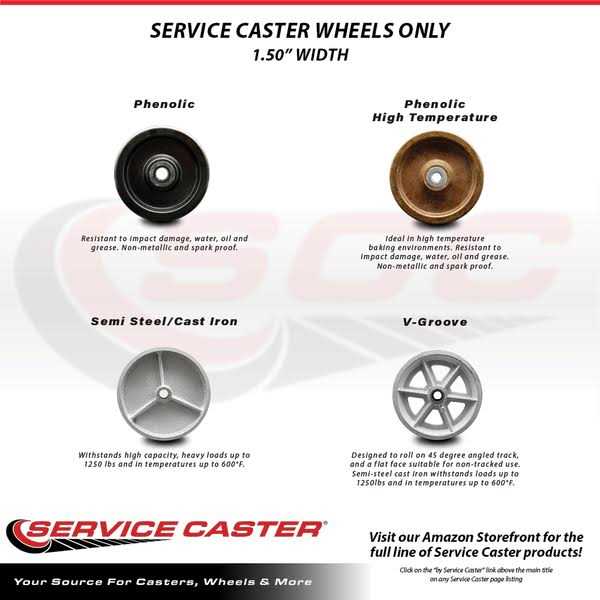 - Service Caster’s Semi Steel Cast Iron wheels come in three sizes – 3” x 1.5″, 4” x 1.5″, and 5” x 1.5″.