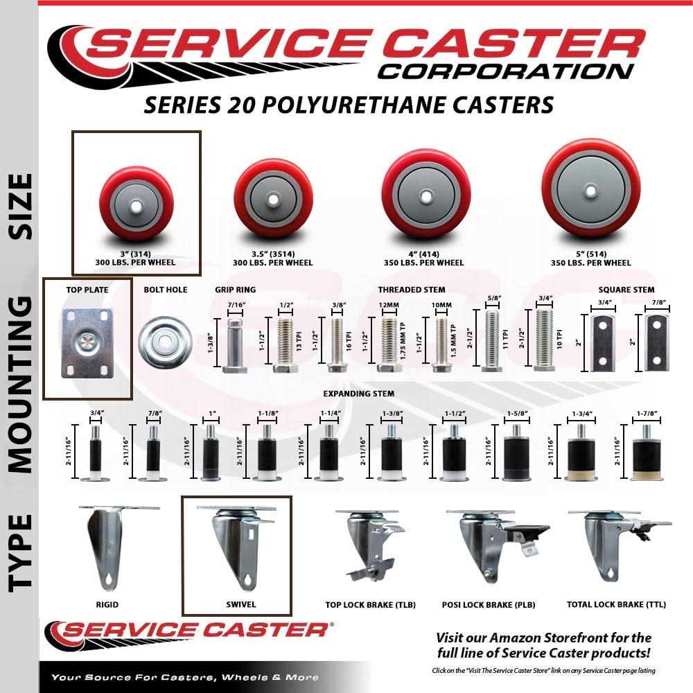 Listing is for one (1) Service Caster Series #20 swivel caster with a 3 inch diameter by 1-1/4 inch wide red polyurethane wheel capable of supporting 250lbs./caster. When searching for a reliable and durable solution to your caster needs, look no further than the Service Caster Series 20 top plate polyurethane casters. The zinc plated finish provides durability under any condition, while the non-marking, non-marring polyurethane wheels perform especially well on hard surfaces such as concrete, tile, and wood- rolling on a finely crafted ball bearing design that keeps you moving forward. Top plate measures at 2-1/2″ x 3-5/8″ with a bolt hole pattern of 1-3/4″ x 2-7/8″ to 3″ and can either be bolted or welded on.