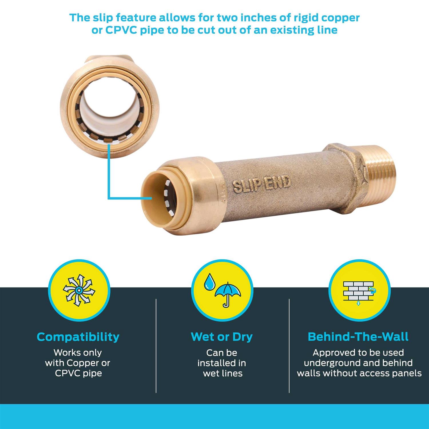 The SharkBite 1/2 in. Push-to-Connect x 1/2 in. Male Pipe Thread Slip Adapter is an innovative repair adapter that allows you to make a quick repair on Copper or CPVC Pipe when transitioning from threaded pipe. The slip adapter allows up to 2 in. of damaged pipe to be removed and repaired. Simply thread the MNPT side and insert the slip adapter onto the other end of pipe completing the connection. The slip adapter is also a great item to have for new Water Filtration System installs, it allows for easy and simple install that requires no solder, clamps, unions or glue.