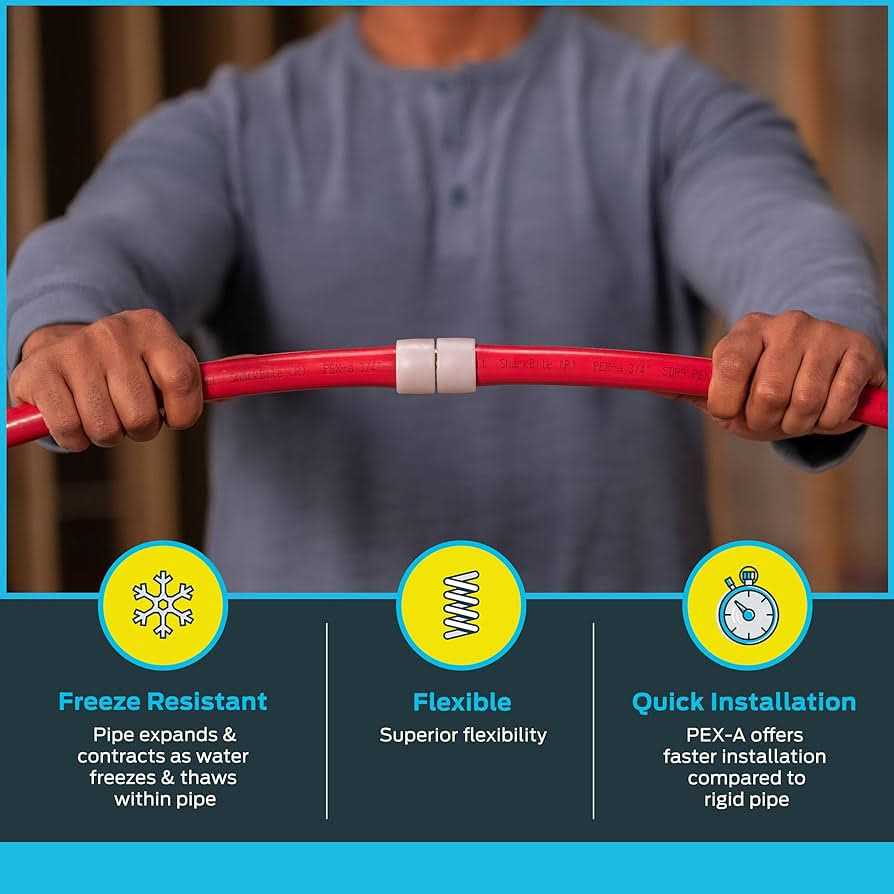 SharkBite PEX-A is a cross-linked polyethylene tubing designed for use in residential and commercial plumbing applications. PEX pipe is flexible and easy to work with, which reduces the number of fittings needed to complete a job, reducing cost and leak points. PEX is also extremely durable and corrosion/freeze resistant. SharkBite PEX-A is compatible PEX F-1960 expansion fittings, EvoPEX fittings, PEX F-1807/2159 crimp fittings or push-to-connect fittings.