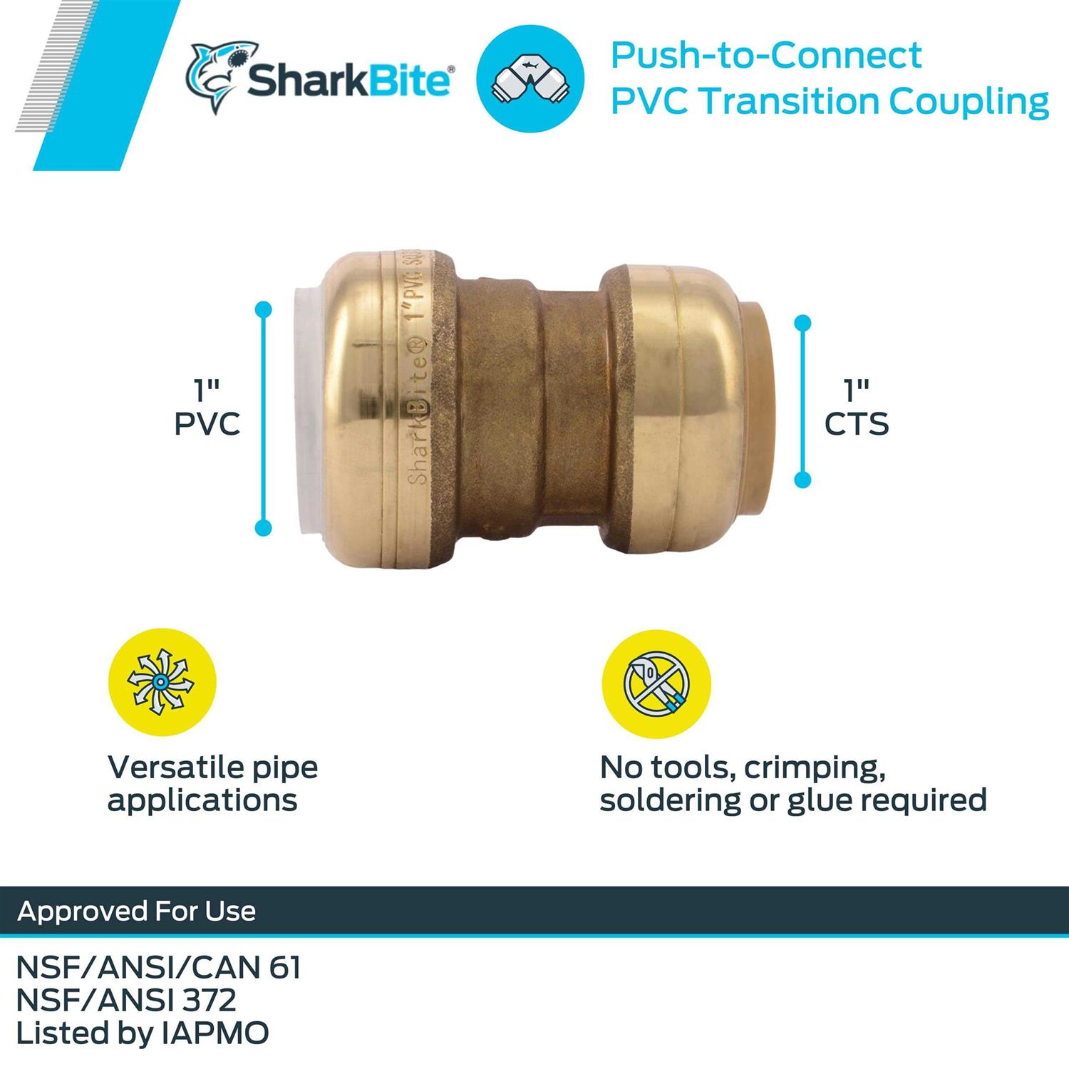 SharkBite PVC transition couplings connect PVC pipe (SCH 40, 80 and 120) to Copper, PEX, CPVC and PE-RT tubing with no solder, clamps, unions or glue required. The white colored collar is intended for use on PVC pipe while the tan colored collar is intended for Copper, PEX, CPVC or PE-RT. This fitting is not intended to be connected to PVC pipe on both sides of the fitting. Instant push-fit connection for increased ease-of-use. Instant push-fit connection for increased ease-of-use. Tan collar fits copper tubing, CTS, CPVC and PEX. White collar fits SCH 40, 80 and 120 PVC pipe. Easy to disconnect and reusable.
