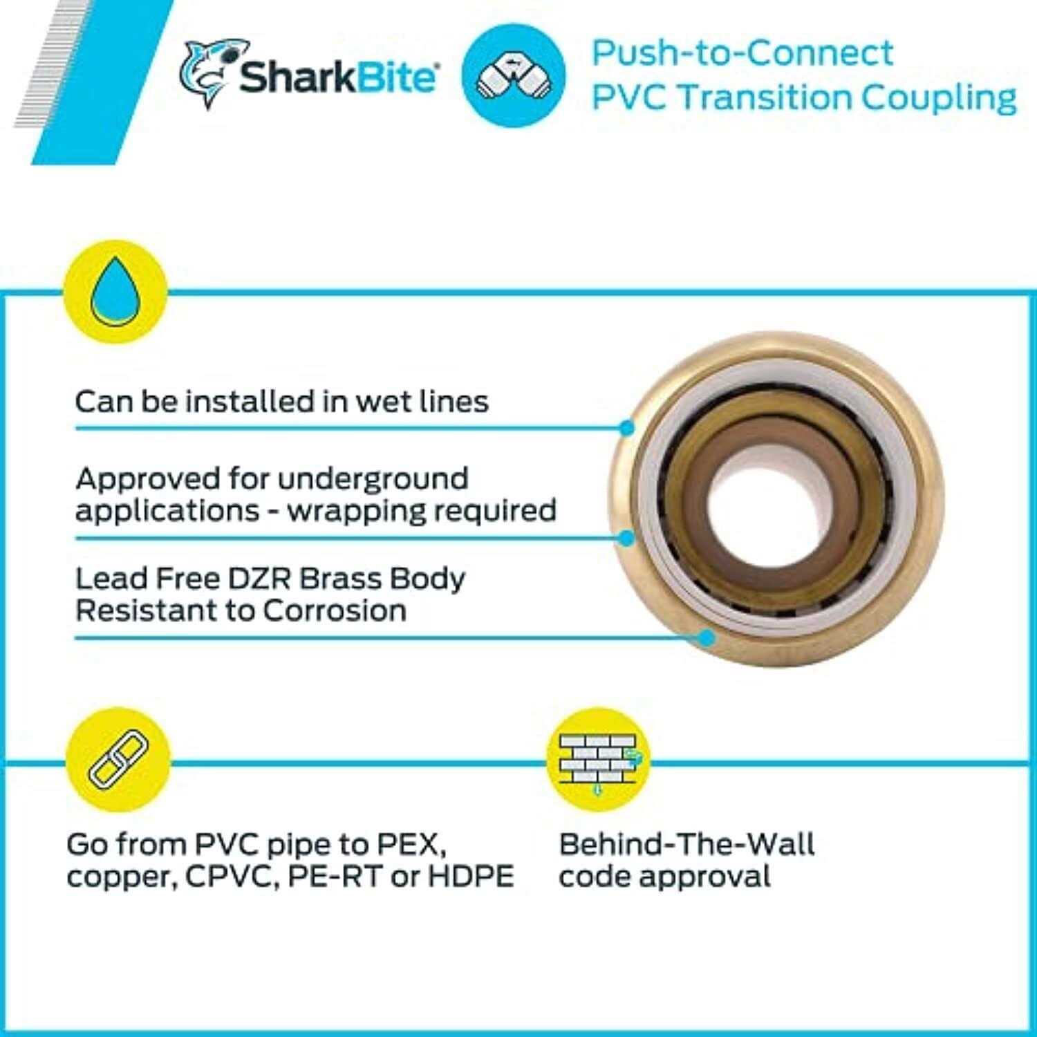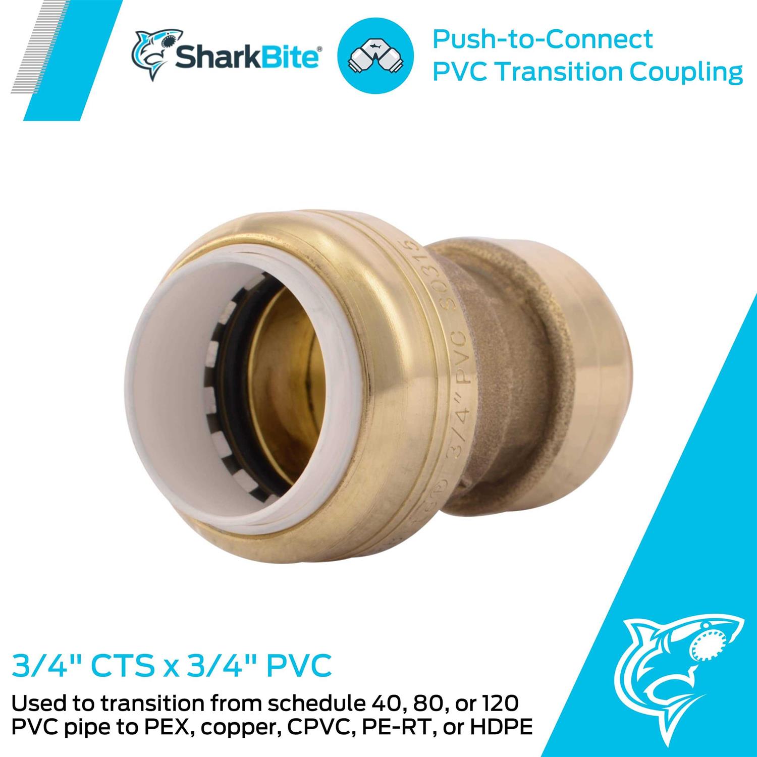 SharkBite PVC transition couplings connect PVC pipe (SCH 40, 80 and 120) to Copper, PEX, CPVC and PE-RT tubing with no solder, clamps, unions or glue required. The white colored collar is intended for use on PVC pipe while the tan colored collar is intended for Copper, PEX, CPVC or PE-RT. This fitting is not intended to be connected to PVC pipe on both sides of the fitting. Instant push-fit connection for increased ease-of-use. Instant push-fit connection for increased ease-of-use. Tan collar fits copper tubing, CTS, CPVC and PEX. White collar fits SCH 40, 80 and 120 PVC pipe. Easy to disconnect and reusable.
