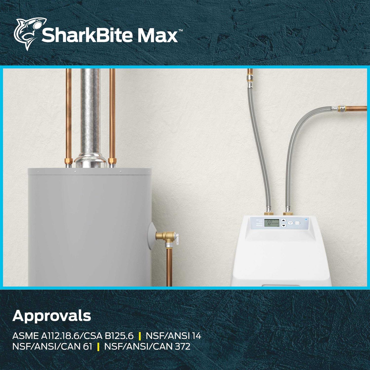 SharkBite Max flexible water softener connectors are the fastest and easiest way to connect your water softener system to existing pipes in your home. A newly designed stainless steel collet retainer delivers additional strength and durability and provides a 200 psi pressure rating. SharkBite Max connectors do not require a PEX tube liner and a re-engineered body allows you to insert the pipe using less force and greater ease. No soldering, clamps, unions, glue or special tools required. After inserting to pipe, stainless steel teeth bite down and grip the pipe tightly while a specially formulated O-ring compresses around the pipe to create a watertight seal. The flexible stainless steel braided hose reduces the need for extra joints or fittings, allowing for faster installs.