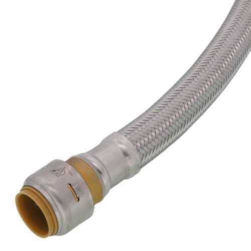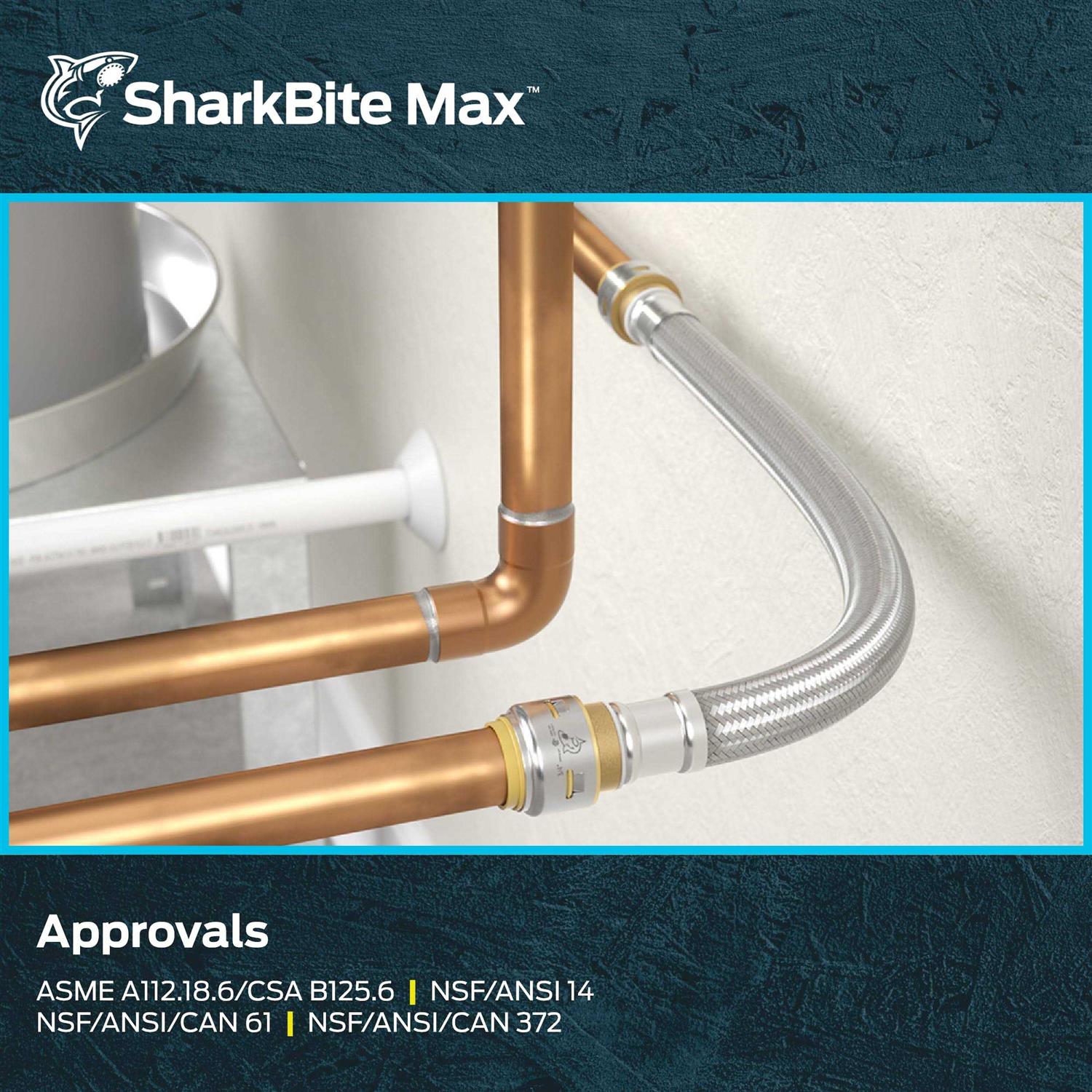 SharkBite Max push-to-connect repair hose is the fastest way to make a quick repair on PEX, copper, CPVC, PE-RT or HDPE pipe. The flexible stainless steel braided hose reduces the need for extra joints or fittings, perfect solution for hard-to-reach tight areas. A newly designed stainless steel collet retainer delivers additional strength and durability and provides a 250 psi pressure rating. SharkBite Max fittings don’t require a PEX tube liner, and a re-engineered body allows you to insert the pipe using less force and greater ease. No soldering, clamps, unions, glue, or special tools required. After inserting the pipe, stainless steel teeth bite down and grip the pipe tightly while a specially formulated O-ring compresses around the pipe to create a watertight seal. The fitting can be rotated after installation for quick adjustments, and removing the fitting is just as fast with a disconnect tool, allowing fittings to be changed or reused.