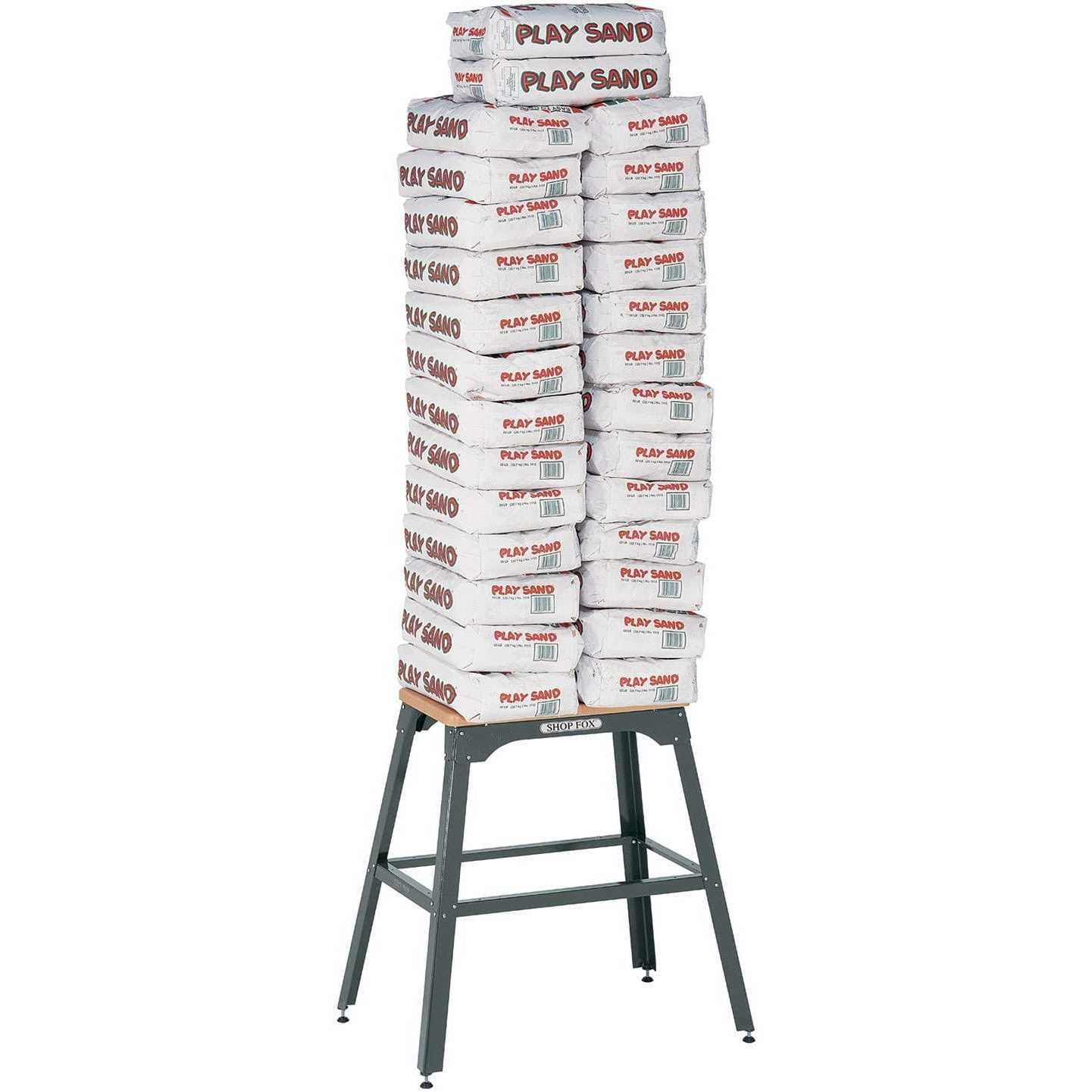 Great for bench-top tools like chop saws drill presses planers scroll saws and bandsaws. Support cross braces on top provide incredible strength and capacity. Flared legs and adjustable rubber feet ensure stability and reduce machine vibration. The particle-board table top (with faux butcher block laminated finish) measures 13″ x 23″ and is 30-1/2″ tall. Bottom measures 21″ x 32″. 700 lb. capacity. Please note: This product is not recommended for use with casters.