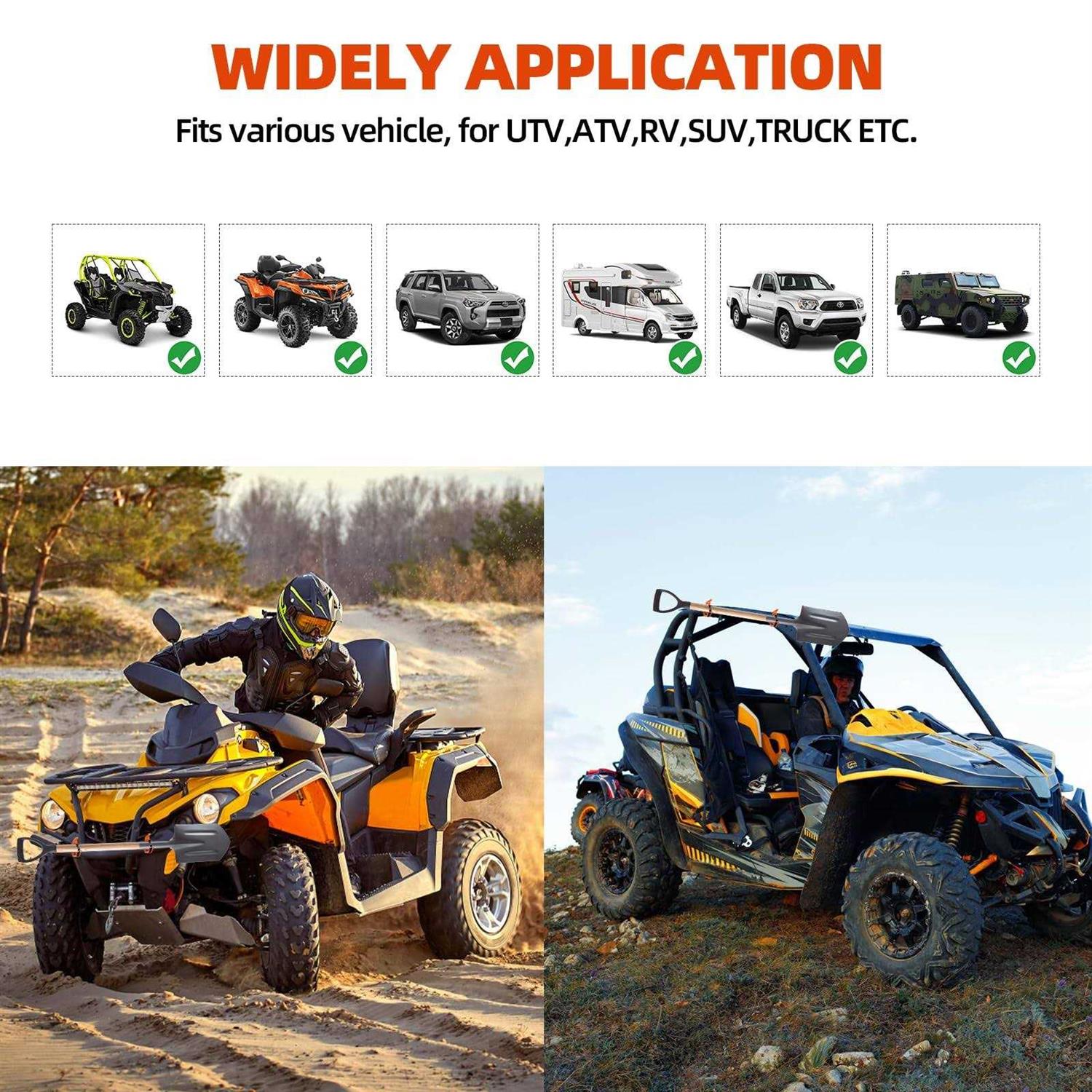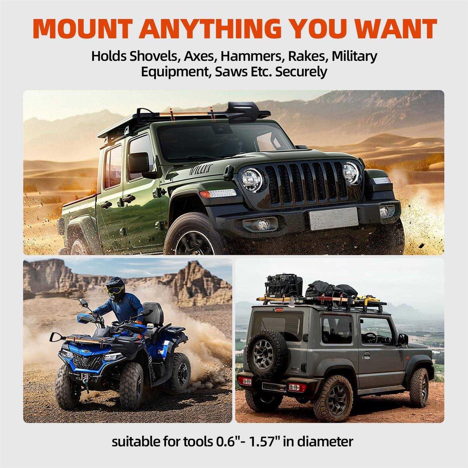 GREAT AXE AND SHOVEL MOUNT: The roof rack shovel mount are crafted from premium grade zinc alloy and provide a strong, stable and secure mount for your car roof racks or garages. The shovel holder allows for efficient storage while preventing tools from rolling on rough roads. METAL RUBBER CLAMP MOUNTING KIT: The shovel holder for truck includes 4 roof rack shovel mounting brackets, 8 fixing screws and 8 fixing nuts. You can quickly mount the shovel holder clamp with drilling within minutes whether mounted tools on a roof rack, truck bed, cargo rack, bumper or on wall. ADJUSTABLE RUBBER STRAP: The shovel mount for roof rack is consist of upgraded metal support brackets and premium rubber buckles, which is strength and hard to rust, corrode and break. The roof rack mounting brackets are for mounting tools in about 0.67-1.57 inches, 2 clamps total load bearing capacity: approximately 62 lbs, bottom mounting area is about 2.56 x 1.28 inches. COMPATIBILITY & WIDE APPLICATION: The axe and shovel mount suitable for trucks, work vehicles, trailers, off-road, 4x4s, ATVs, RVs, boats etc. An ideal versatile truck accessories, shovel clamp mounting kit is a good addition to outdoor adventure and camping. This roof rack shovel mount is not restricted to trucks and boats, it can be used on any type of MOLLE panel, garage, shed, or workshop. SECURE SHOVEL MOUNT: Use the metal rubber clamp mount kit to install shovel, axes, hammer, rake, hoses, military equipment securely in place both horizontally and vertically, the sturdy construction and convenient wall mounted design provide the ideal storage solution. Warm tips: Please make sure the installation area and supported diameters of our axe holder mount to meet your needs before purchasing. 4 Pcs Shovel Mount For Roof Rack, Metal Rubber Clamp Mounting Kit, Quick Release Axe Holder Clamps Wall Mount Kit, Shovel Holder For Truck Boats Off-Road Car Accessories And Overlanding Gear For Tool Holder Consist of: Heavy duty metal supporting brackets and premium rubber buckles; Bottom Mounting Area: 6.5 x 3 cm/2.55 x 1.18 inch Support Diameter: 0.67-1.57 inch/1.7-4 cm Load Bearing Capacity: 1 Clamp: 31 lbs 2 Clamps:62 lbs Package Includes: 4x roof rack mounting brackets, 8x fixing screws, 8x fixing nuts Shovel Mount for Roof Rack The universal roof rack mount straps is a safe and secure option for traveling with your axe and shovel. Can be used to attach just about anything to the top, bottom or sides of your roof rack. Of all the accessories for the more car roof rack this is the must have.