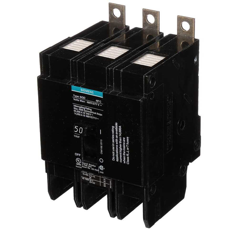 Siemens 3-Pole 3-Phase BQD type molded case circuit breaker finds application in load centers. It has a voltage rating of 480Y/277 VAC and current rating of 50 Amps at 40 deg C. It has an interrupt current rating of 14000 Amps at 480 VAC Star/277 VAC. It measures 3 Inch x 2.700 Inch x 4.490 Inch. It features panelboard mounting for perfect positioning and offers thermal-magnetic protection. Bolt-on circuit breaker accommodates aluminum wire of size 6 – 1/0 AWG and copper wire of size 8 – 1 AWG. Circuit breaker is UL listed and HACR/HID rated.