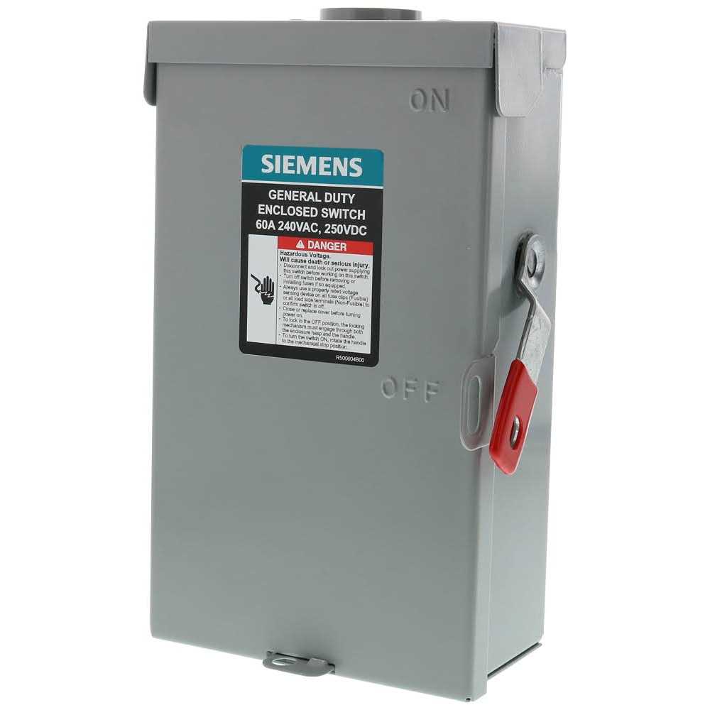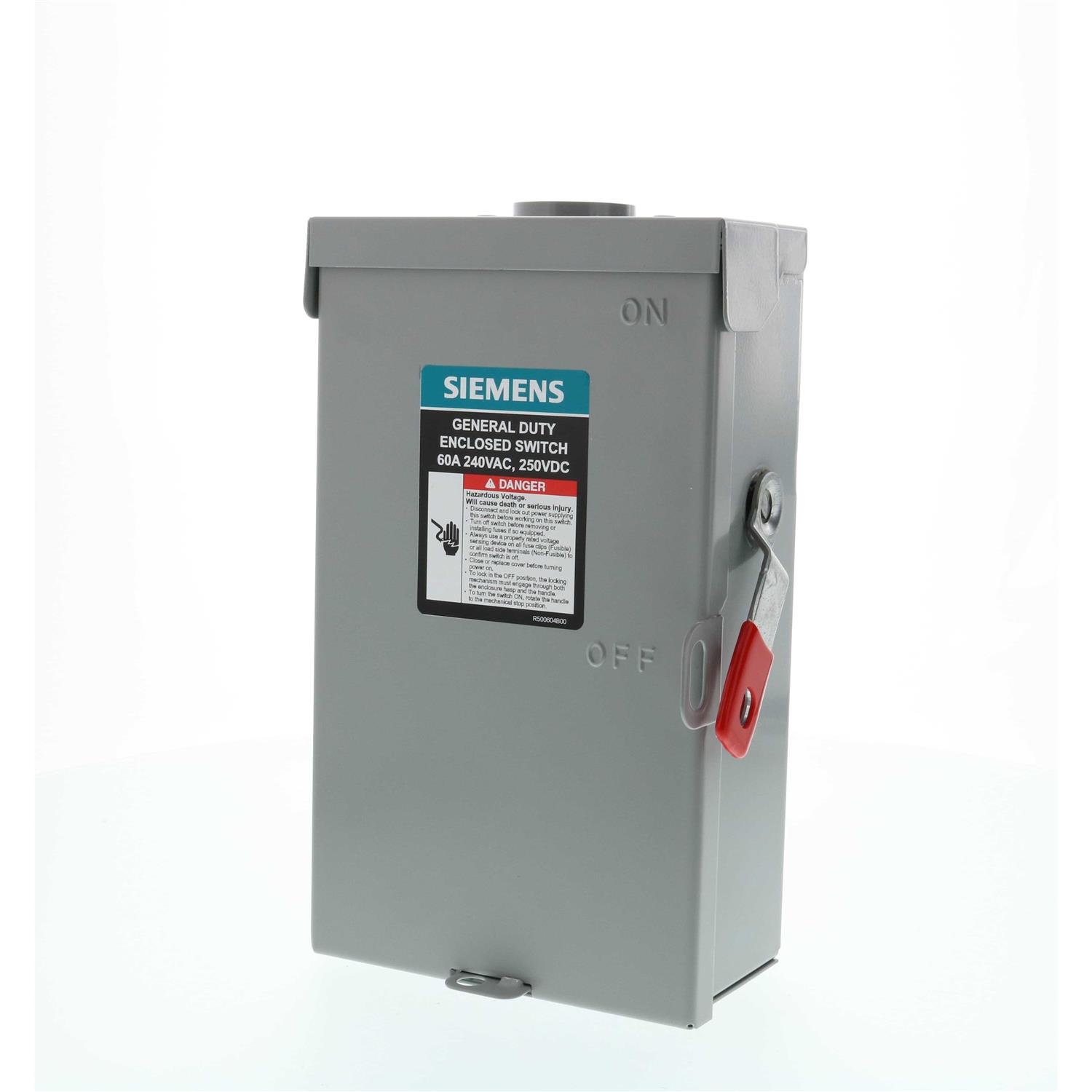 Siemens General Duty Safety Switches are intended for applications where reliable performance and continuity of service are needed, but where duty requirements are not severe and usual service conditions prevail. These switches are intended for use primarily with supply circuits rated 240V AC or less where the available fault current is less than 100, 000A when used with Class R or T fuses, or 10, 000A max when used with Class H fuses. All switches are provided with imbedded “ON” and “OFF” indicators and padlocking provisions on the handle and door. All switches are UL listed. Fuses not included on fusible device. Use HA type hubs if required.