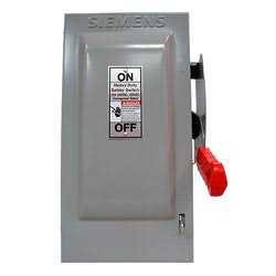 Siemens Low voltage circuit protection heavy duty safety switch features 304 stainless steel construction for added strength and durability. It has voltage rating of 240-Volts AC as well as 250-Volts DC and has current rating of 200-Amps. This 3-Pole 4-Wire metallic switch features 3PST contact configuration. It measures 16.98-Inch x 12.33-Inch x 31.07-Inch. This 3-Phase NEMA-1 rated safety switch features quick-make, quick-break operating mechanism that assures positive operation. The highly visible self-aligning blades assures positive contact and highly visible On/Off handle indication. It is designed for use with grounded B-Phase system service entrance equipment. The safety switch meets UL, NEMA KS-1 and CBC standards.