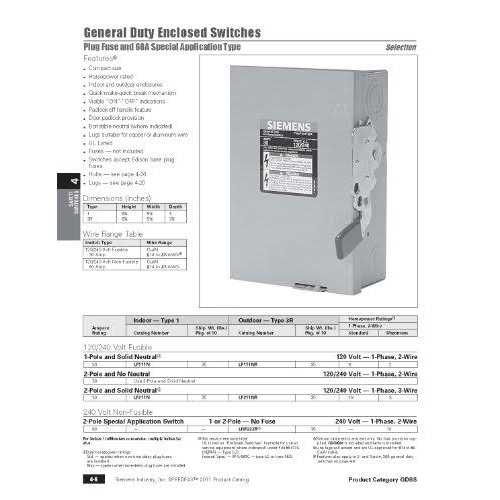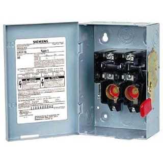 SIEMENS general duty safety switches have a compact size, are horsepower rated, and have a quick make-quick break mechanism. All switches are provided with highly visible “ON” and “OFF” indicators and padlocking provisions on the handle and door. All switches are UL listed and are suitable for copper and aluminum wire. Fuses not included on fusible devices and accept Edison base plug fuses. Use HA type hubs if required.