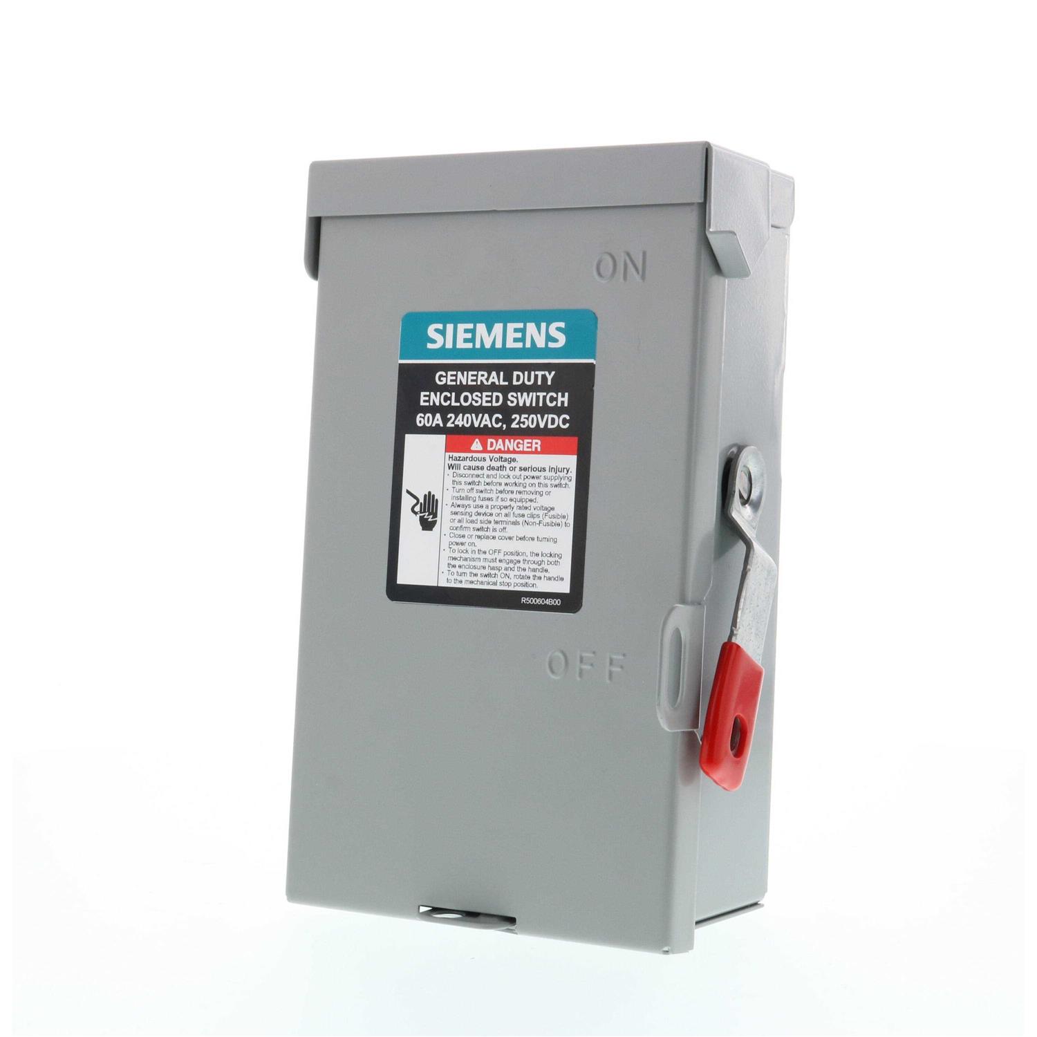 Safety Switches by SIEMENS. Details:Siemens General Duty Safety Switches are intended for applications where reliable performance and continuity of service are needed, but where duty requirements are not severe and usual service conditions prevail. These switches are intended for use primarily with supply circuits rated 240V AC or less where the available fault current is less than 100,000A when used with Class R or T fuses, or 10,000A max when used with Class H fuses. All switches are provided with imbedded “ON” and “OFF” indicators and padlocking provisions on the handle and door. All switches are UL listed. Fuses not included on fusible device. Use HA type hubs if required.