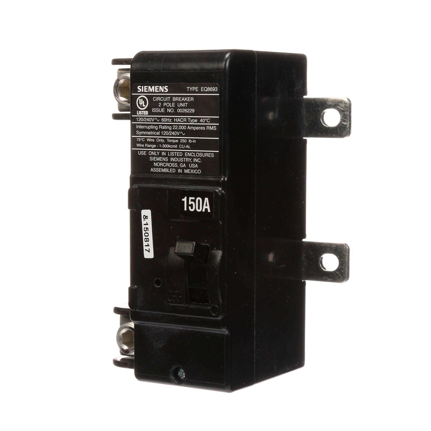 This 150 Amp main breaker kit is intended as a replacement for main breakers installed in the Siemens EQ series of load centers. The kit can be installed on Siemens EQ 150 and 200 Amp main breaker load centers. The production of EQ load centers was halted in 2002, being replaced with the Siemens Ultimate series of load centers. This kit will not fit on the Ultimate, ES, or PL series of load centers. Check the panel wiring diagram to determine the series type.
