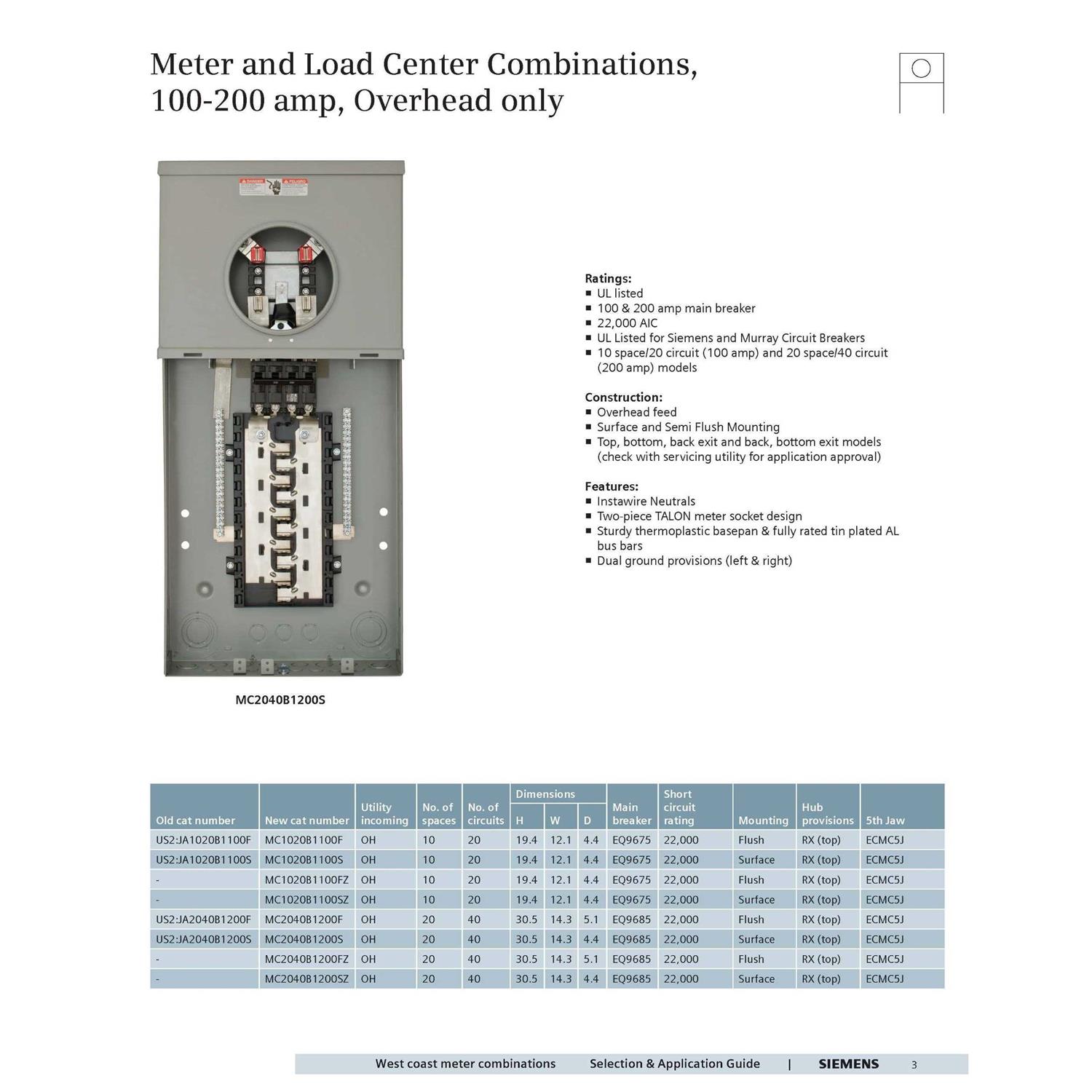 Suitable for use only as service entrance equipment. For overhead feed applications. Pad locking provisions on all devices. UL Listed for use with Siemens and Murray breakers. NEMA Type 3R Outdoor Enclosure. Contact local utility company to confirm meter socket approval prior to ordering and installation.