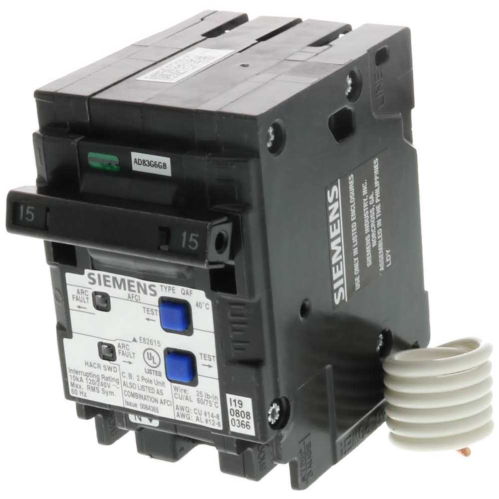 The Siemens 15-Amp 2-Pole Combination AFCI Circuit Breaker reduces wiring costs and installation time by enabling contractors to use multi-wire branch circuits, commonly known as “shared neutrals”. When using single pole CAFCIs, a dedicated neutral is required for each circuit. This breaker allows electricians to share neutrals between the two circuits fed by the breaker. CAFCI Breakers are designed to protect against line-to-ground arcs, line-to-neutral arcs and series arcs to help protect your home from an electrical fire. The breaker is intended to mitigate the effects of arcing faults by de-energizing the circuit when an arc-fault is detected.