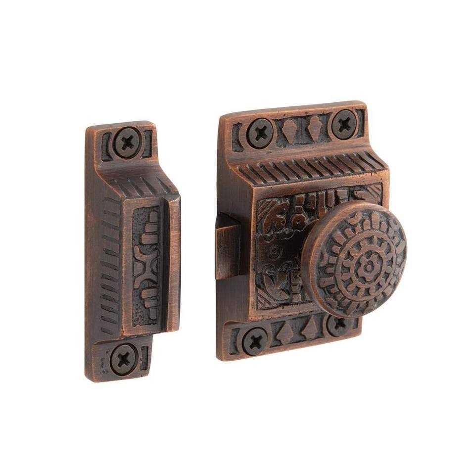 This cabinet latch features the arrows, fencing and flowers common to the Windsor design, making it an ideal antique reproduction piece. An easy-twist knob makes it practical for everyday use. – Constructed from brass for long lasting durability and strength – Easy-to-use twist knob to open – Latch is spring-loaded to hook automatically – Signature Hardware 918667 Specifications:Height: 2-1/4 inch – Width: 1-1/2 inch – Projection: 1-1/4 inch – Faceplate measures: 1-1/2 inch L x 1-1/4 inch W (front to back) x 2-1/4 inch HCatch plate measures: 3/4 inch L x 3/4 inch W (front to back) 2-1/4 inch H