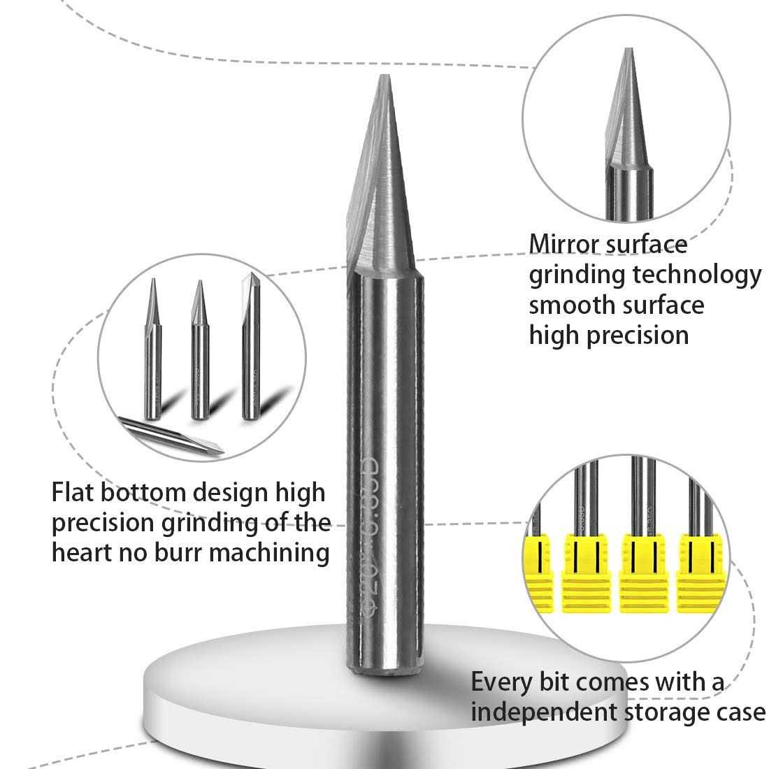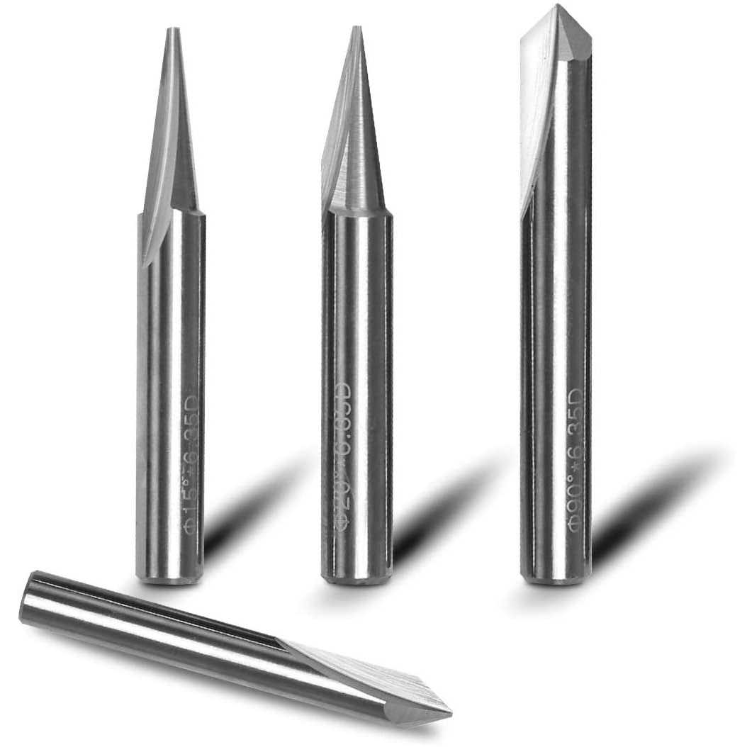 PERFECT FOR MANICURIST OR BEGINNEREngraving and lettering just got a little easier with SILIVNs Engraving CNC Router Bits. Try it on your 2D or 3D carving. The deep angle and sharp point allow for precise details. EXTREME HARDSILIVN craving router bits are made of tungsten steel, which offers better cutting strength and premium drilling outcomes than other ordinary carbide steel craving bits in the market, time will tell which one last longer. EXTREMELY VERSATILE4 different sizes CNC engraving bits set to satisfy all you demand: 15 degree detail carving bit for carving liner/20 degree profile bit a flat cut tip for outlining letters in wood signs,tracing lines and cleaning/60 and 90 degree V bits are great for V-groove.Every bit comes with a independent storage case.Please move slowly when using the detail bit. GOOD CUTTING PERFORMANCE Fastly engrave and cut, extremely sharp edge provides smoothly cutting, no glitches and high precision.which is able for fast engraving that makes high efficienc.