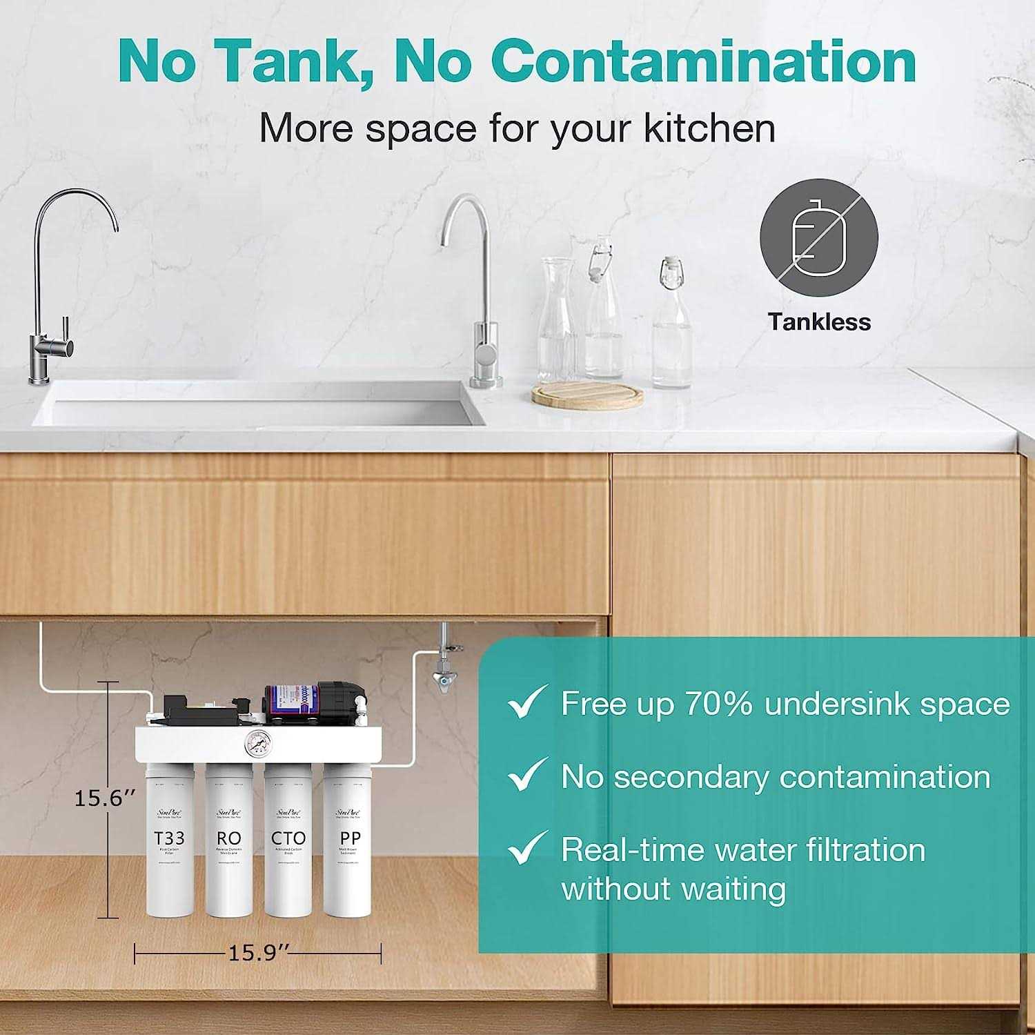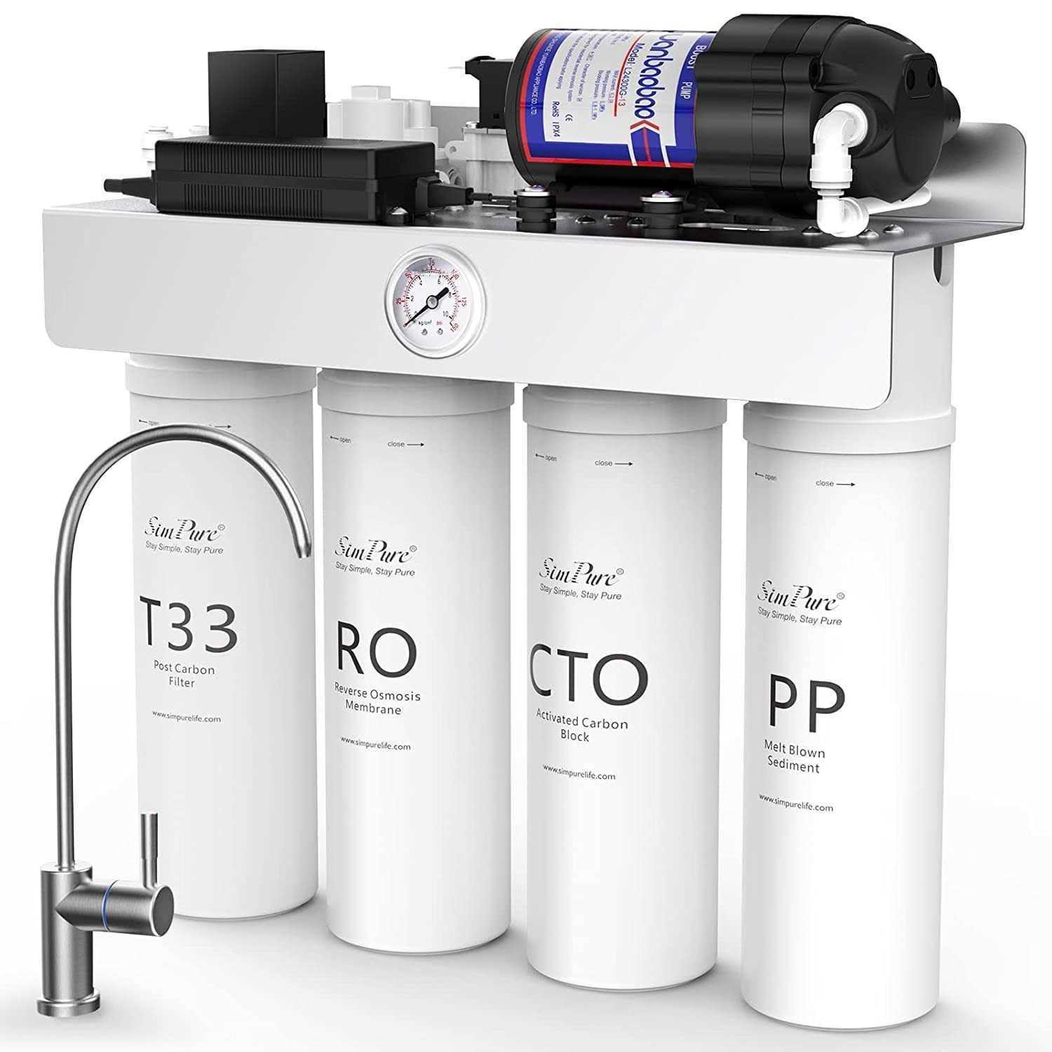 SimPure High Quality Tankless Water Filter with RO UV System Really Worths Your Trying! Upgraded 8 Stage RO+UV Tankless Reverse Osmosis System 400 GPD High Flow Rate & Tankless RO Design Unbelievable Efficiency 1.5:1 Low Pure to Drain Ratio TDS Reduction Nearly Zero Pre-membrane Pressure Detection: Filter Replacement Reminder Twist-in Filter Design, Change Filters in 3 Seconds Note: You must fully turn on the faucet and flush the tankless RO system for 20 minutes after installation. With PP+CTO+T33+RO+UV 5-Stages water filtration, it can remove up to 99.99% of Chlorides, Chemicals, Lead, Hydrogen Sulfide, fluoride, Chloramines, Heavy metals, PFAS, TDS, pharmaceuticals, microplastics, Viruses, Bacteria, and 1,000+ of other contaminants. This tankless RO system is also a BPA and Lead-free under cabinet reverse osmosis system. Tankless RO+UV Water Filter System Equipped with UV sterilizer, this tankless ro water filter system is not only effective at removing bacteria like E. coli, coliforms, salmonella, and a range of other viruses and water parasites. It effectively removes up to 99.99% of harmful microorganisms in water. Combined with 7-Stage RO Filtration System, this tankless RO+UV water filter system will provide an extra level of purification for your drinking water compared with under cabinet reverse osmosis systems, especially recommended for well water sources. Just buy one and taste the difference! Best Tankless Reverse Osmosis System for Under Sink With TDS Reduction Nearly Zero SimPure high-efficiency RO Filter removes contaminants 0.0001 microns or greater in diameter. This tankless ro water filter system is equipped with SimPure exclusive filtration technology, so the TDS level of the tap water removal rate to 95%, with a maximum rate of 99.99%, which is the best reverse osmosis system for TDS Reduction. If the TDS of your tap water is between 0-200ppm, the filtered water will be close to 0ppm. SimPure T1-400 can reduce the TDS of tap water with less than 200 PPM to near 0 PPM, while the tap water with 200- 500 PPM can reduce below 25 PPM or lower. This best tankless reverse osmosis system is also equipped with a high-precision water pressure gauge and 4 filters, which are more efficient and last longer than similar products on the market. Tankless & No Waiting Under Sink Design: Best Tankless Reverse Osmosis System This under sink tankless reverse osmosis water filtration system requires only a fraction of the space under the sink, saving up to 70% undersink space. The SimPure T1-400 tankless RO water filter system offers a faster flow rate of 400GPD (0.28 gallons per minute), supplying pure water instant, on demand and no waiting. There’s no potential for secondary pollution, either. (RO systems with tank require at least 2-4 hours for the tank to fill before use and have to use an extra filter to remove any bacteria or microbiological contaminants that might have collected in the water while it was stored in the tank.). 400 GPD & 1.5:1 Pure to Drain Ratio: A Real Sustainable Under Sink Tankless RO System SimPure T1-400 tankless under sink ro system equipped with a boost pump and offers faster water flow (400GPD, 0.28 gallons per minute) and can filter a cup of water in about 12 seconds. Compared to traditional RO systems, SimPure tankless reverse osmosis system has a low pure to drain ratio of 1.5:1 ( Produces only 1 gallon of wastewater for every 1.5 gallons of pure water). This means you can reduce your own plastic waste – saving money on bottled water. Filter Replacement Alerts & Twist-in Filter System, Filters can be Changed in 3 Seconds SimPure T1-400 tankless ro water system is equipped with a water pressure gauge, which reminds you to replace the filter more intelligently and scientifically, without having to remember the date of the last filter change. And Compared to typical RO systems, its unique Twist-in filter design avoids kinks and leaks, making filter replacements a breeze and easy replacement in 3 seconds. Filter Replacement Reminder: If it is found that the water flow is small but the pressure value of the membrane is large, the RO filter needs to be replaced. And if the water flow and membrane pressure values are found to be very small, other filters need to be replaced 400 GPD High Flow Rate & Tankless RO Design. Unbelievable Efficiency 1.5:1 Low Pure to Drain Ratio. TDS Reduction Nearly Zero. Pre-membrane Pressure Detection: Filter Replacement Reminder. Twist-in Filter Design, Change Filters in 3 Seconds. Note: You must fully turn on the faucet and flush the tankless RO system for 20 minutes after installation.