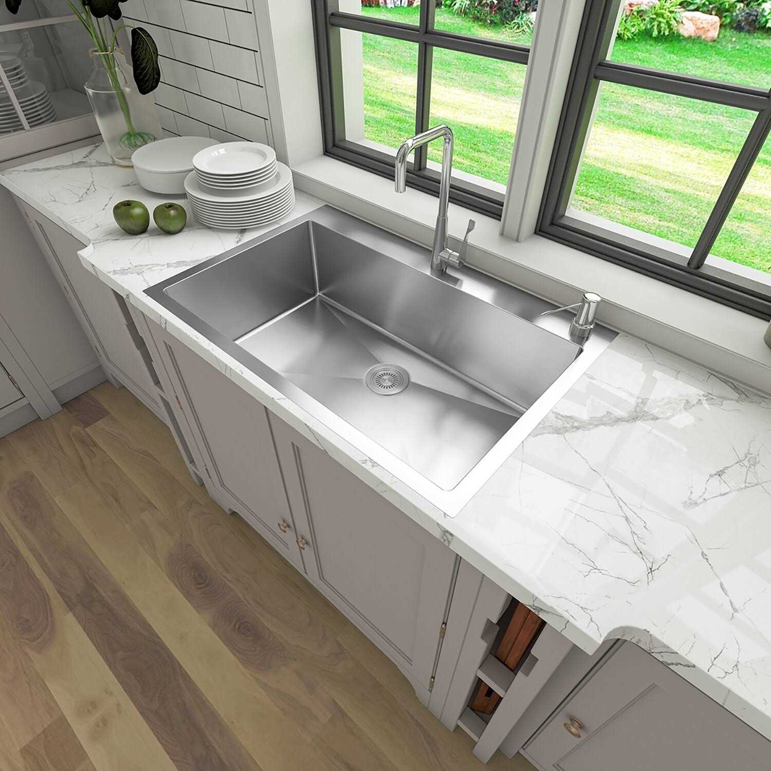 Make an update to your kitchen workstation with this 33-in. drop-in single bowl sink. Rubber dampening pads and stone guard undercoating reduce noise. For lasting use and easy cleaning, it offers 18-gauge 304 stainless steel and a rust-resistant, commercial-grade satin finish.
