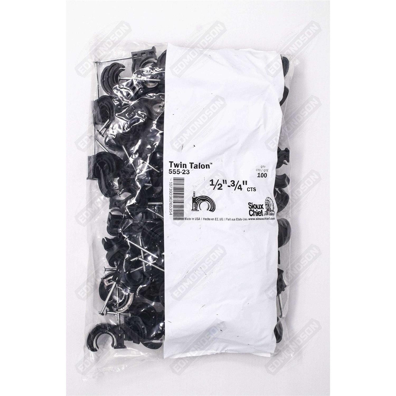 Sioux Chief 555-23 are Twin Tube Talons with Nails. One talon size fits all (3) pipe sizes 1/2″, 5/8″ and 3/4″. Compatible with PEX tubing, copper pipes and CPVC pipes. Can be used to secure tubing / piping to wooden surfaces,such as joists, studs, beams, subfloor, etc. Designed to offset the tubing from the mounting surface and eliminate or reduce noise problems associated with thermal changes in the plumbing/heating system.