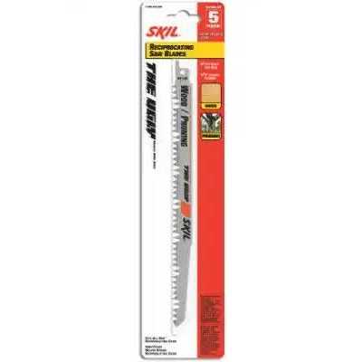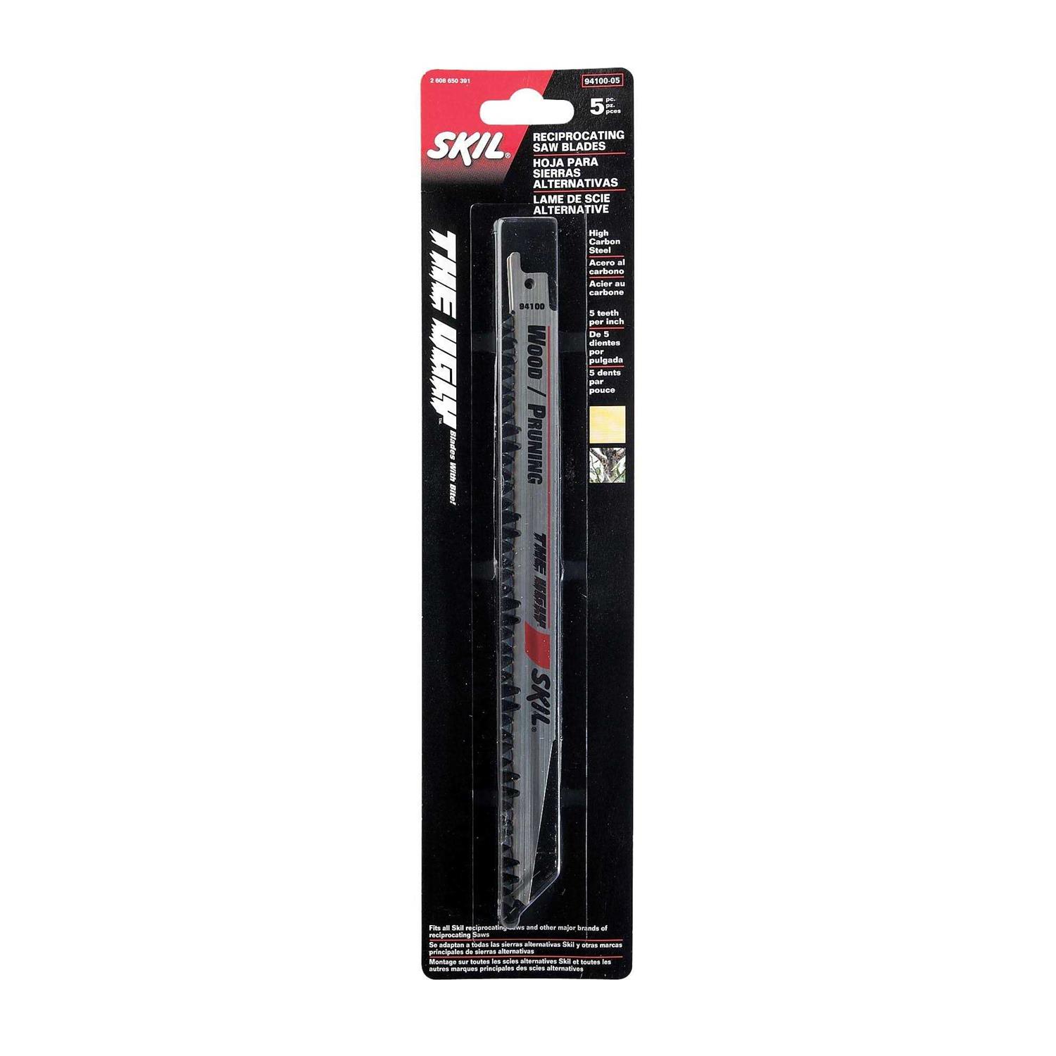 The Skil 94100 Pruning Reciprocating Saw Blades are designed for extremely fast cutting in wood, pressure treated lumber, wet wood and composition board. These blades feature a fleam ground design that let you cut on both forward and reverse strokes. With 4-5 TPI and 9 inches in length, and made of strong and durable high carbon shell with fire-hardened cutting edges, the Skil 94100-05 blades can also be used for pruning. Five blades are included in the pack. These blades fiat all Skil and most other major brand reciprocating saws.