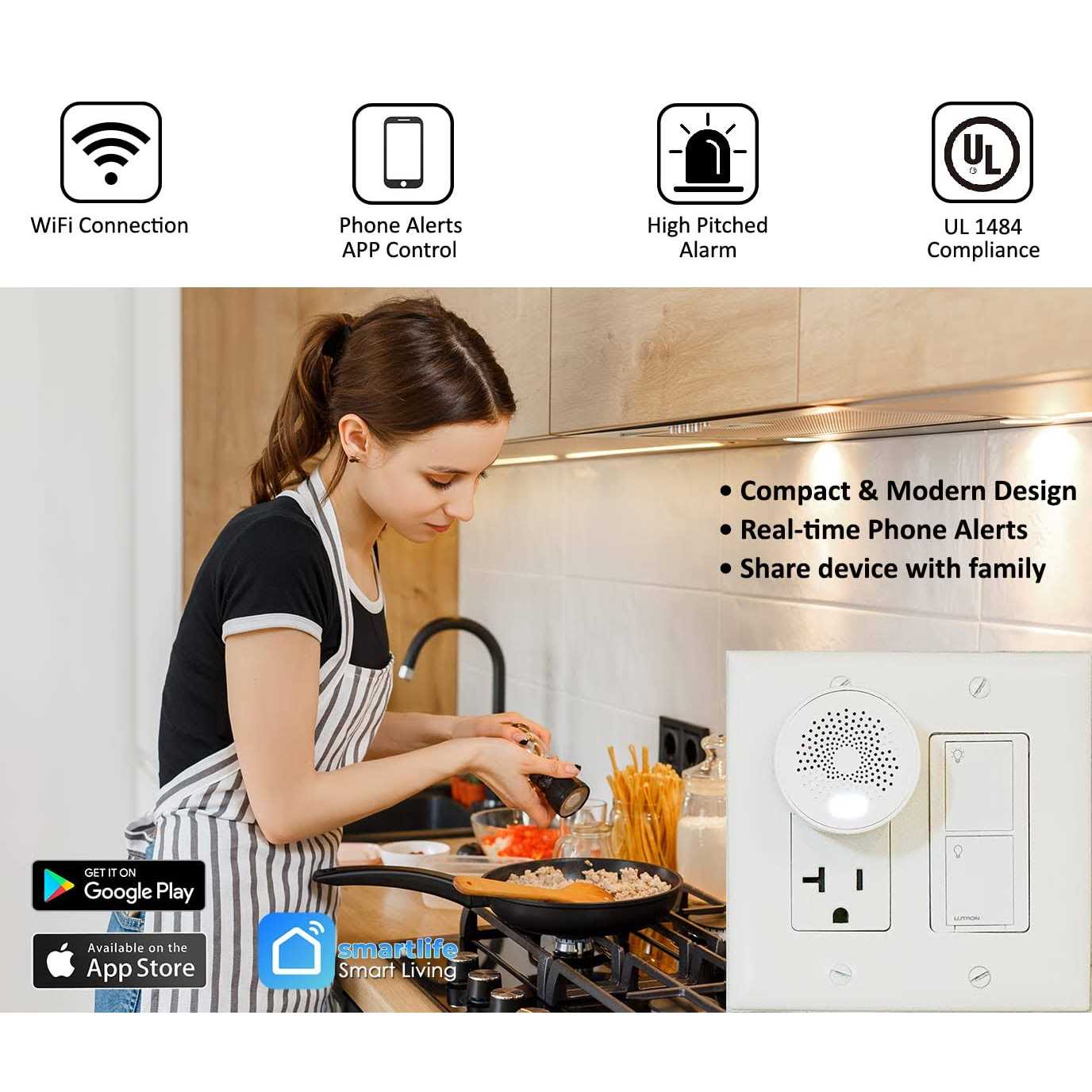 Genuine and Original Smarter Living branded Gas Detector, not a chinese copy. Lab tested and in compliance with UL 1484 certification for Residential Gas Detectors. Plug-in Smart Wifi Gas Leak Sensor and Detector (Natural Gas, Propane, LPG, LNG, Methane & Butane and other Flammable Gases) for Kitchen, Basement, Garage, Home, RV, Camper. Detect a gas leak and be warned by a loud 70dB Sound Alarm plus phone notifications via Smart Life and Tuya App. Audible Alarm will still sound, regardless of Wifi connectivity (2.4GHz WiFi only required to receive phone notifications). No Gateway required to operate (ie ZigBee hub or other gateway). App displays concentration level of gas in real-time. History alarm log. User selectable alarm sound from 5 available options. Modern design with a white LED status indicator light which helps blend in with most kitchens, and does not attract unwanted attention. Different color LEDs are used for alarm and other status updates. Works between 85v and 250v. Will work on 120v in USA and Canada.