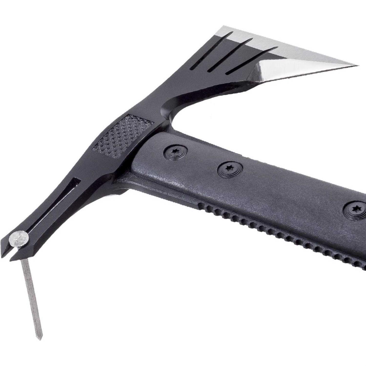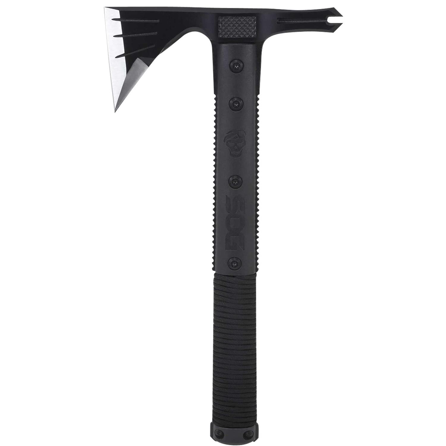 The axe from the quality American brand, SOG, is made of 2CR stainless steel which is a steel grade that is rustproof and guarantees hardness and durability. The hardness is expressed with the Rockwell C scale, and this axe has the hardness 47-49 RC. The handle is made of reinforced Nylon so that the axe can be used comfortably. The axe also comes with a fire starter and paracord.
