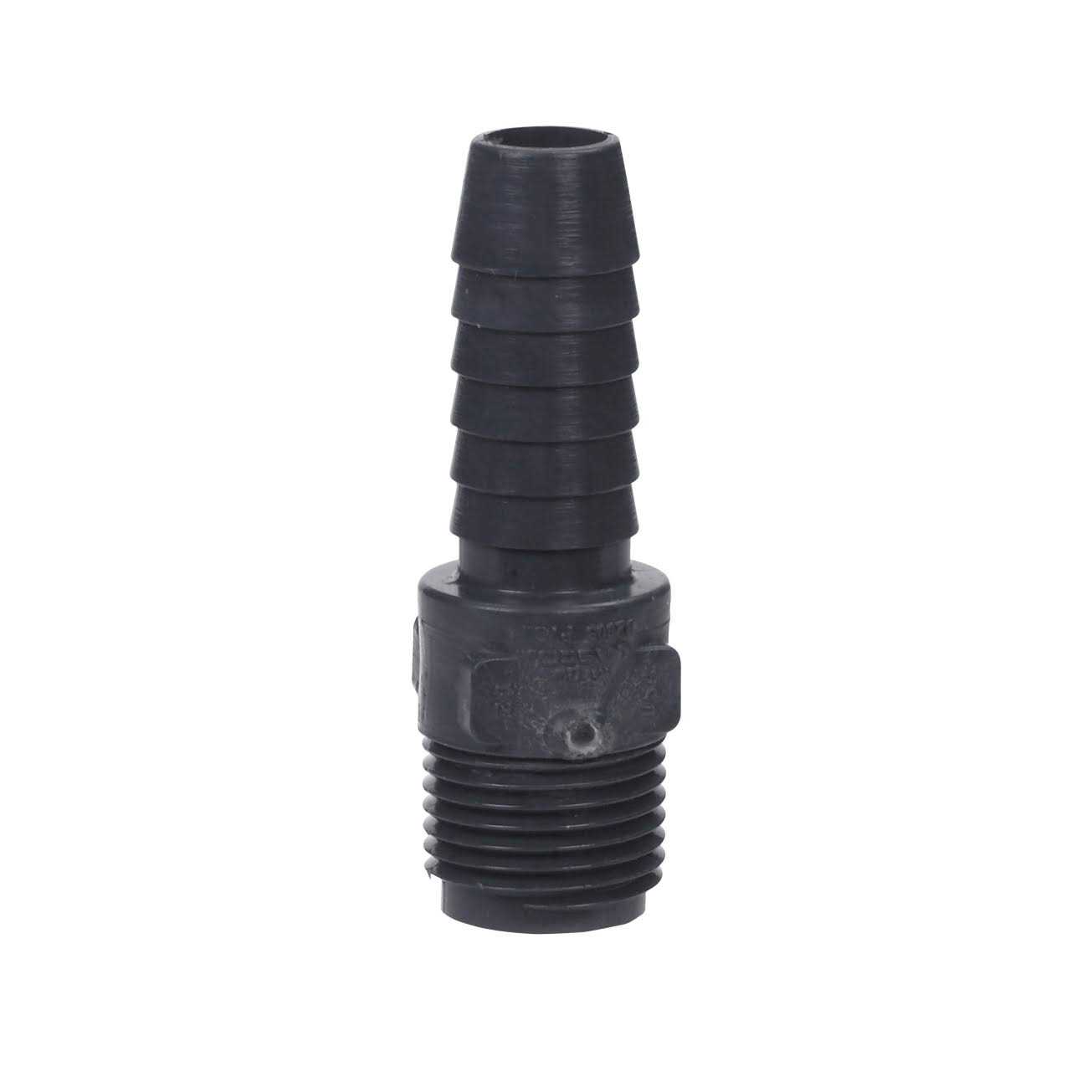 This Spears 1436 series tube fitting is made of gray polyvinyl chloride (PVC) plastic and has a male National Pipe Thread (NPT) thread on one end and a barbed insert on the other for connection to ASTM International schedule 40 polyethylene (PE) pipe in a straight run. The adapter’s barbed fitting creates a tight seal on flexible PE pipe when used with a hose clamp (sold separately). The PVC fitting has a maximum working pressure that is dependent on the PE pipe it is used with, a maximum working temperature of 140 degrees F, and resists reactions with acids, gasoline, alcohol, and hydrocarbons. This male barb tube fitting meets ASTM D2609 standards for plastic insert fittings for use with PE pipe, ASTM schedule 40 standards for wall thickness,and is NSF International 61 certified for use with potable water.Pipe fittings are components used for connecting, terminating, controlling flow, and changing the direction of piping in many different industries. When purchasing pipe fittings, consider the application, as this will affect material type, shape, size and required durability. Fittings are available threaded or unthreaded, in many shapes, styles, sizes, and schedules (pipe wall thickness). Spears Manufacturing produces thermoplastic fittings and valves for fluid, drain, waste, and vent systems. The company, founded in 1969 and headquartered in Sylmar, CA, meets International Organization for Standardization (ISO) standard 9001.