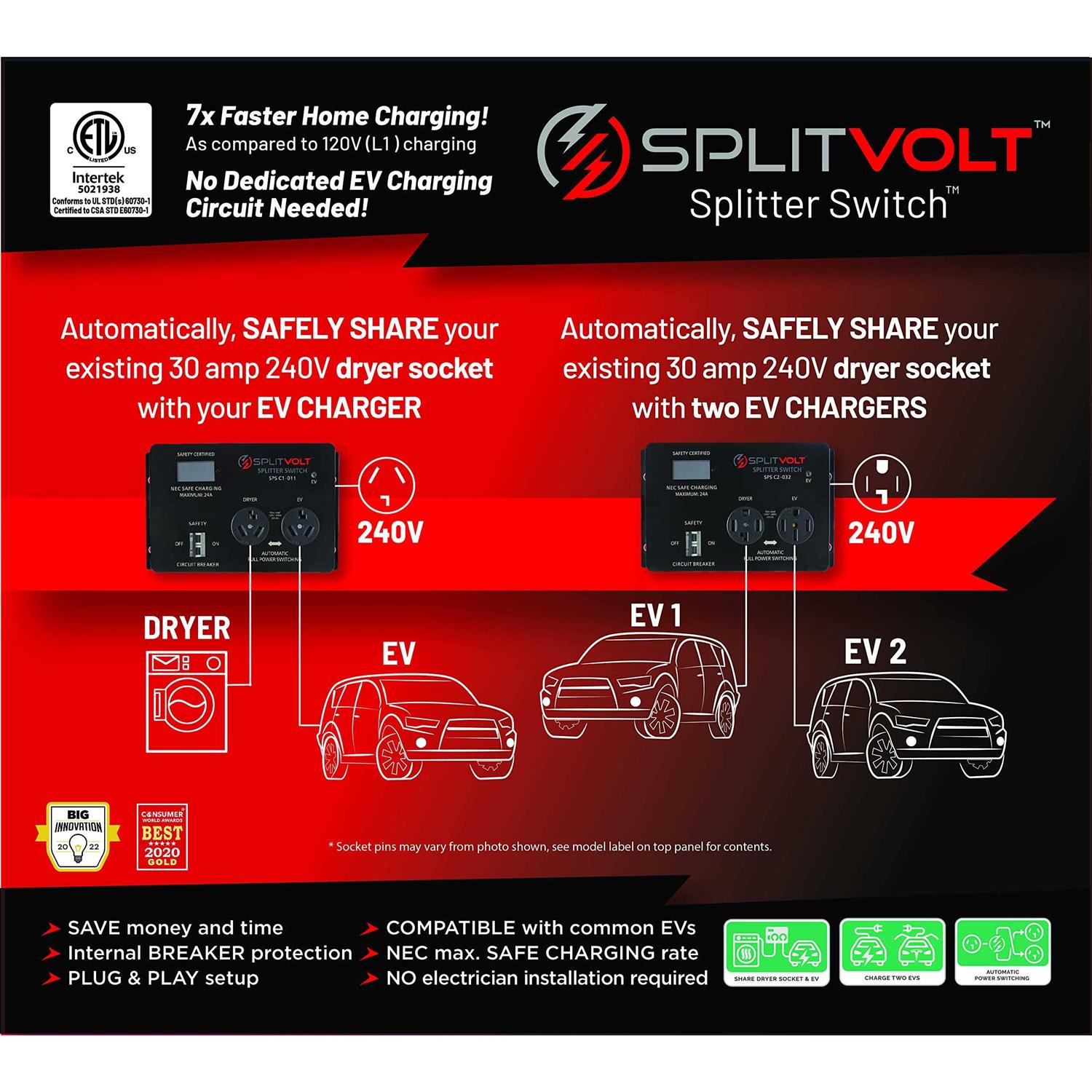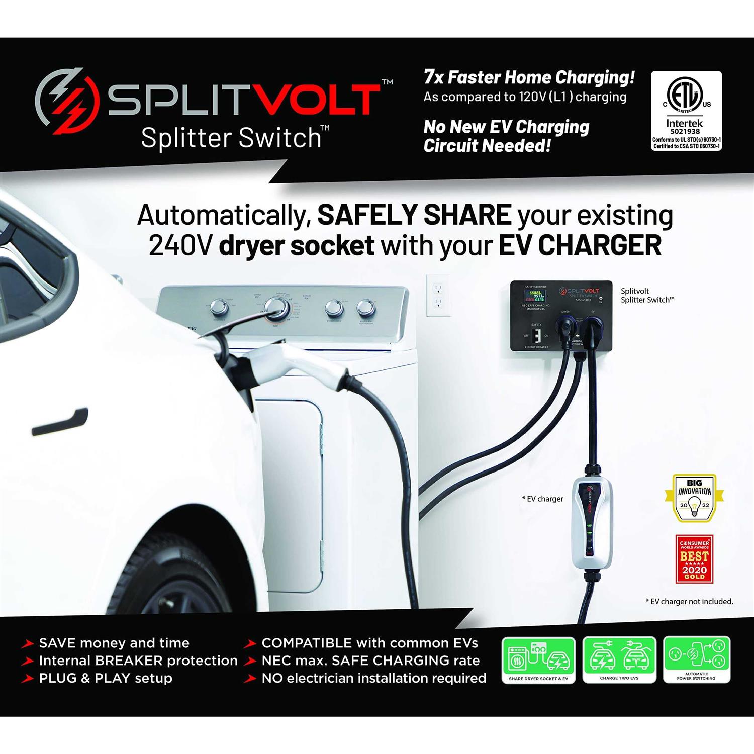 SAVE TIME & MONEY – Our NEW cETLus Certified Electric Vehicle Household Appliance power splitter. Instantly Provides Household Power for a Level 2 EV Charger. This home upgrade electrical switch allows you to share your dryer outlet with your car fast charger so saves you time and money! DON’T PAY for a New Charging Circuit – Splitvolt automatic power switch safely shares an existing 220v – 240v Dryer Socket with an EV Charger. Allowing your EV Charging Station to share the same outlet as your dryer. Our electric splitter is cETLus Certified and works in conjunction with common EV car chargers. PLUG-AND-PLAY: Home upgrades made easy. No Electrical Installation Required! Just Plug It In and You Have Safe, L2 EV Fast Home Charging in Minutes. This Splitvolt Splitter Switch provides Level 2 power for your EV car charger without requiring electrician installation. FAST and SAFE: Internal Safety Breaker Protects Home Wiring from Exceeding the 24 Amp NEC Maximum Safe EV Charging Rate, While Display Shows Real-Time Power Usage. Power your charging station with this cETLus Certified Splitter Switch so you can rest assured your EV charger is safe. THIS MODEL Supports Standard NEMA 10-30 Plugs and Outlets for Dryer and EV Chargers and Supports Common Third-party EVs and EV Chargers. Refer to the pictures on the product page to verify that your outlets match the correct model. With the longer ranges of EV batteries today charging from, a 110-volt socket is just too slow! But having an electrician come out and add a dedicated 240-volt socket takes extra time and money. The Splitvolt Splitter Switch is the perfect EV charging accessory that allows you to intelligently and seamlessly share your dryer socket with your EV charger!
