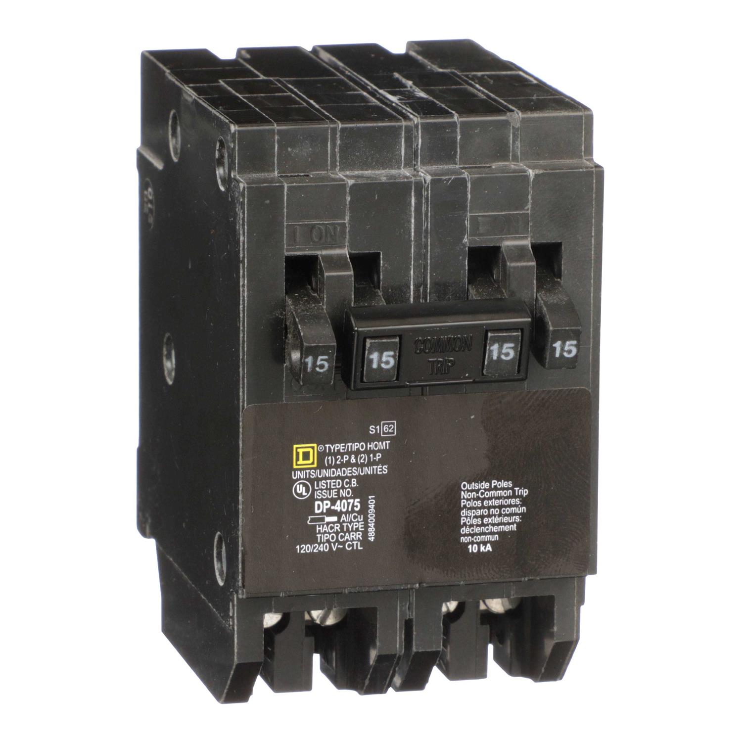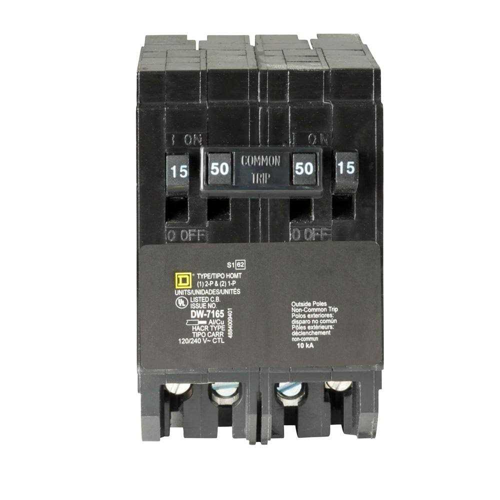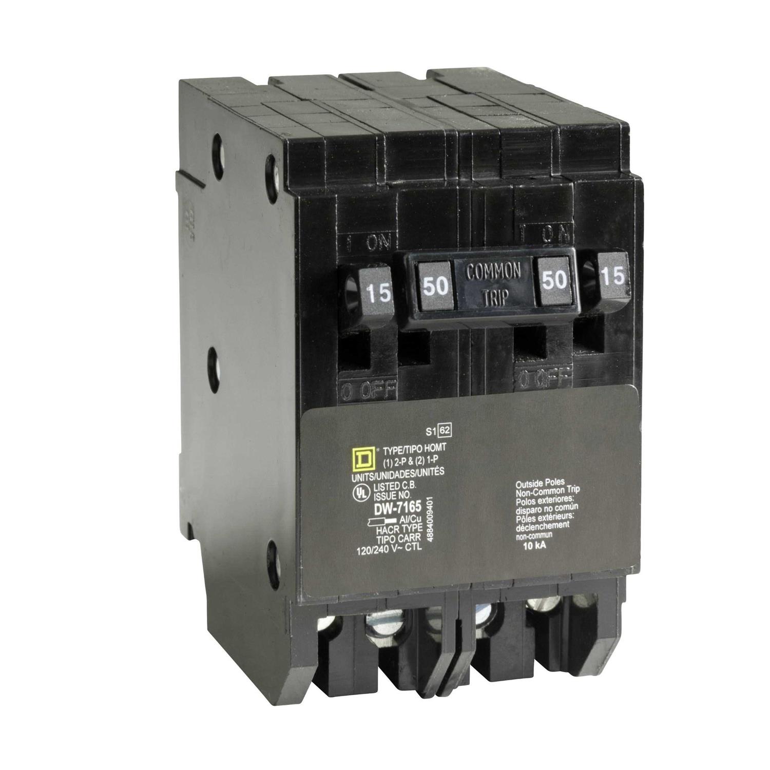 Homeline miniature circuit breakers are engineered and designed for fast installation and superior circuit protection. Homeline circuit breakers are designed to plug into Homeline load centers to provide circuit protection. This HOMT circuit breaker is a quad tandem breaker. This quad tandem breaker occupies two HOM pole spaces. This quad tandem circuit breaker consists of a two pole breaker in the middle and a single breaker on each side. This quad tandem circuit breaker provides a standard circuit protection and is HACR rated. The two pole breaker is rated 50A at 120/240 VAC and the single pole breakers are rated 15A and 15A at 120/240 VAC. This circuit breaker provides 10 kA breaking capacity. The 2 pole breaker of this quad tandem breaker will accept 14 AWG to 6 AWG copper or 12 AWG to 6 AWG aluminum wire. The single pole breakers of this quad tandem breaker will accept 14 AWG to 8 AWG copper or aluminum wire. The tandem breaker is 3.13 inches tall, 2.00 inches wide and 2.98 inches deep. HOMT tandem breakers are UL Listed. Circuit breaker is consumer packaged.