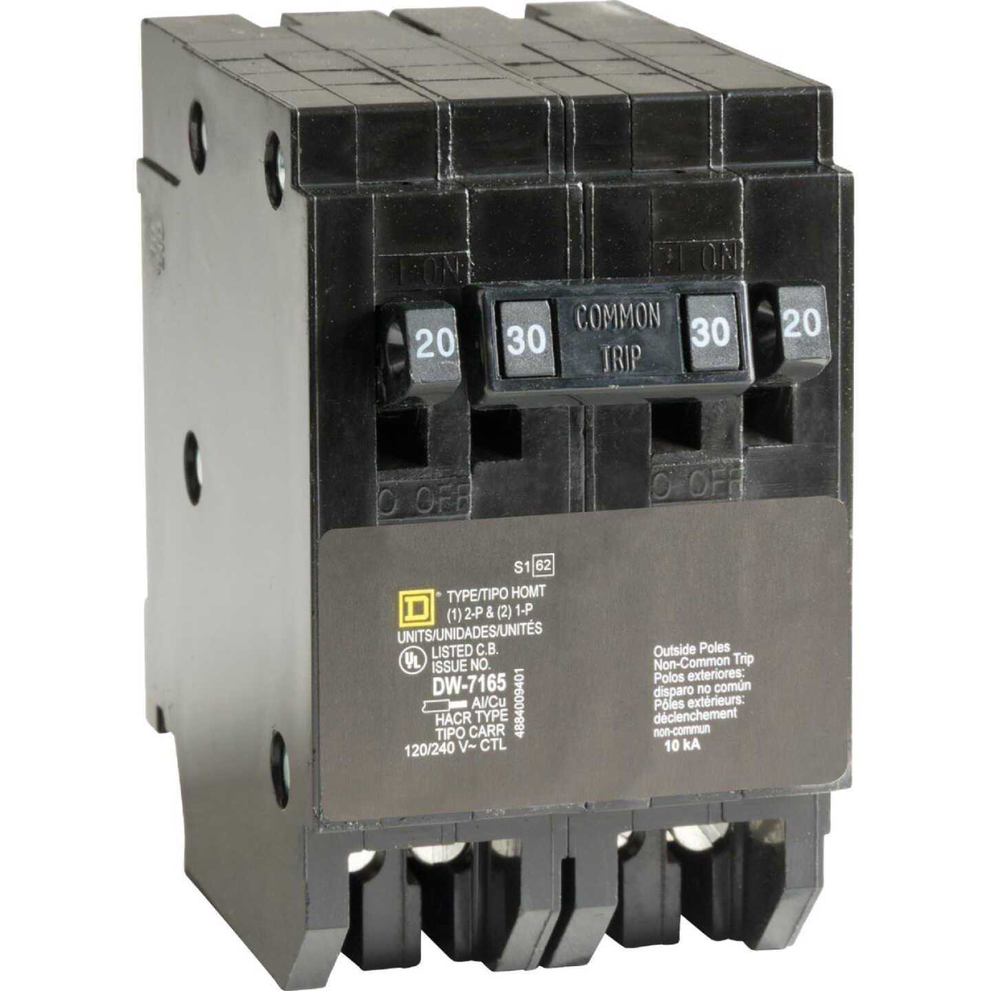 Homeline miniature circuit breakers are engineered and designed for fast installation and superior circuit protection. Homeline circuit breakers are designed to plug into Homeline load centers to provide circuit protection. This HOMT circuit breaker is a quad tandem breaker. This quad tandem breaker occupies two HOM pole spaces. This quad tandem circuit breaker consists of a two pole breaker in the middle and a single breaker on each side. This quad tandem circuit breaker provides a standard circuit protection and is HACR rated. The two pole breaker is rated 30A at 120/240 VAC and the single pole breakers are rated 20A and 20A at 120/240 VAC. This circuit breaker provides 10 kA breaking capacity. This quad tandem breaker will accept 14 AWG to 8 AWG copper or aluminum wire. The tandem breaker is 3.13 inches tall, 2.00 inches wide and 2.98 inches deep. HOMT tandem breakers are UL Listed.