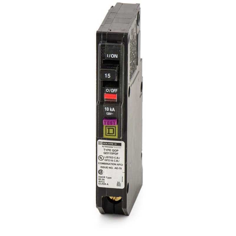 Square D QO Dual function arc/ground fault circuit breaker has an interrupt current rating of 10-Kilo-Amps, current rating of 15-Amps and voltage rating of 120-Volts AC at 50/60-Hz. This 1-Pole, 1-Phase circuit breaker has one space and pressure plate terminals for connection. The circuit breaker features long time, instantaneous thermal magnetic trip unit that trips during short circuits. This plug-in mountable circuit breaker accommodates 14-8-AWG copper/aluminum conductors. It is suitable for use with QO load centers. The circuit breaker meets UL, CSA and RoHS standards.