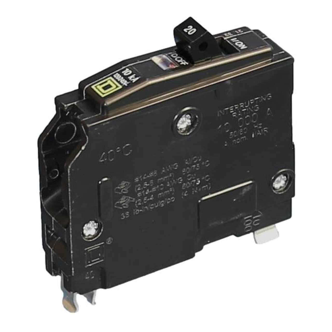 Schneider Electric Switch · It has interrupt rating of 10 kilo-Amps at 120/240 VAC and 5 kilo-Amps at 48 VDC. It accommodates copper or aluminum wire size of 14 – 8 AWG. It offers effective overload and short circuit protection for added safety. The 1-Phase circuit breaker measures 0.750 Inch x 2.910 Inch x 3 Inch and provides long-time instantaneous trip functions to perform efficiently. It is ideal for QO load centers, NQ/NQOD panel boards/interiors and speed-D switchboard distribution panels. It features reliable pressure plate terminal and VISI trip indicator for convenience. Breaker requires one space and uses plug-on mounting to hold firmly. Circuit breaker is UL listed/CSA certified and meets Fed. Specs W-C-375B/GEN standards.