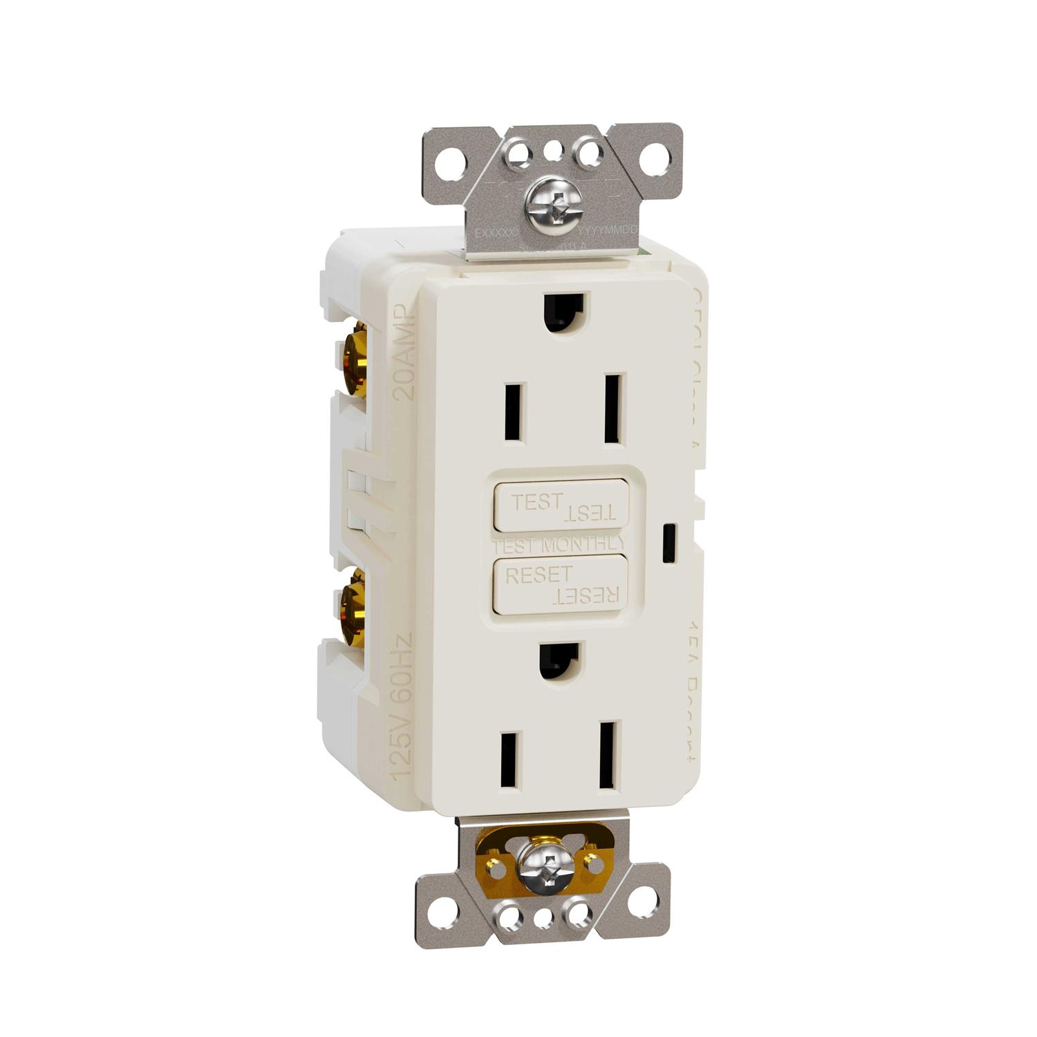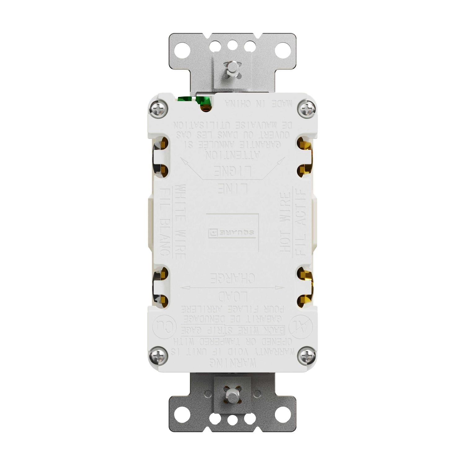 The Square D X Series 15A 125V Tamper Resistant GFCI Duplex Decorator Receptacle with Back Wire Clamps provides enhanced safety for kitchen and bathrooms with discrete, tamper-resistant black shutters and auto-monitoring testing to ensure it’s ready to protect your devices. Featuring high impact-resistant, non-glossy, easy-to-clean thermoplastic body for attractive, long lasting operation. Complete the look with one of the Square D X Series cover plates (not provided) that easily snaps into place for a modern, flush-facing finish to your walls. Enjoy a consistent look in your room or home with the full line of Square D X Series switches, dimmers, sensors, and receptacles. Color: Matte Light Almond.