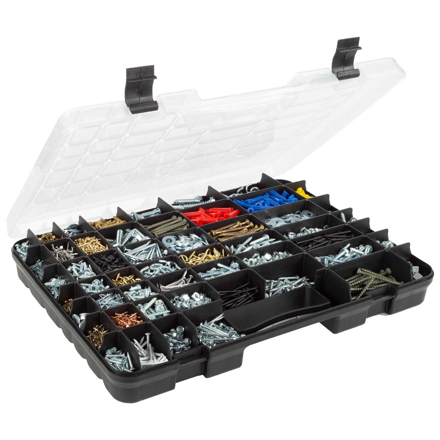 Keep your workspace, craft room, or garage meticulously organized with this multi-sectional tool box. This versatile organizer is a game-changer for anyone looking to declutter and categorize small items like screws, nails, or beads, thanks to its assortment of compact compartments. With a clear lid for easy viewing and secure latches to keep contents in place, this portable toolbox is as practical as it is durable. From Stalwart.