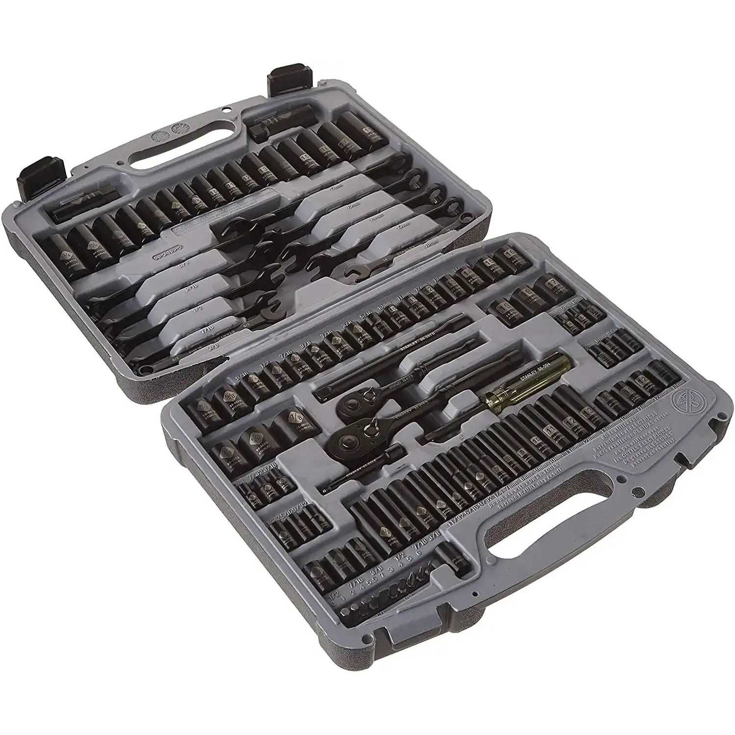 Bodies are forged from chrome vanadium. Six-point and eight-point sockets reduce fastener rounding and/or slippage. Each socket wrench features a quick-release & reversible mechanism for easy operation. All components meet or exceed ANSI specifications. Each kit includes pear-head ratchets, deep well sockets, standard sockets, a spinner handle, extension bars, spark plug sockets, a set of bits, and a durable plastic carry case. Includes (19) 1/4 in. Dr. 6 pt. Standard sockets, (14) 1/4 in. Dr. 6 pt. Deep sockets, (19) 3/8 in. Dr. 6 pt. Standard sockets, (17) 3/8 in. Dr. 6 pt. Deep sockets, (3) 3/8 in. Dr. 8 pt. Deep sockets, 3/8 in. Dr. 6 pt. Spark plug sockets – 5/8-in, (10) combination wrenches – sae and metric, 1/4 in. Dr. Pear head ratchet, 3/8 in. Dr. Pear head ratchet, 1/4 in. Dr. 3 in. Extension bar, 3/8 in. Dr. 6 in. Extension bar, 1/4 in. Dr. Spinner handle, (10) specialty bits, bit adapter, blow molded carry case.