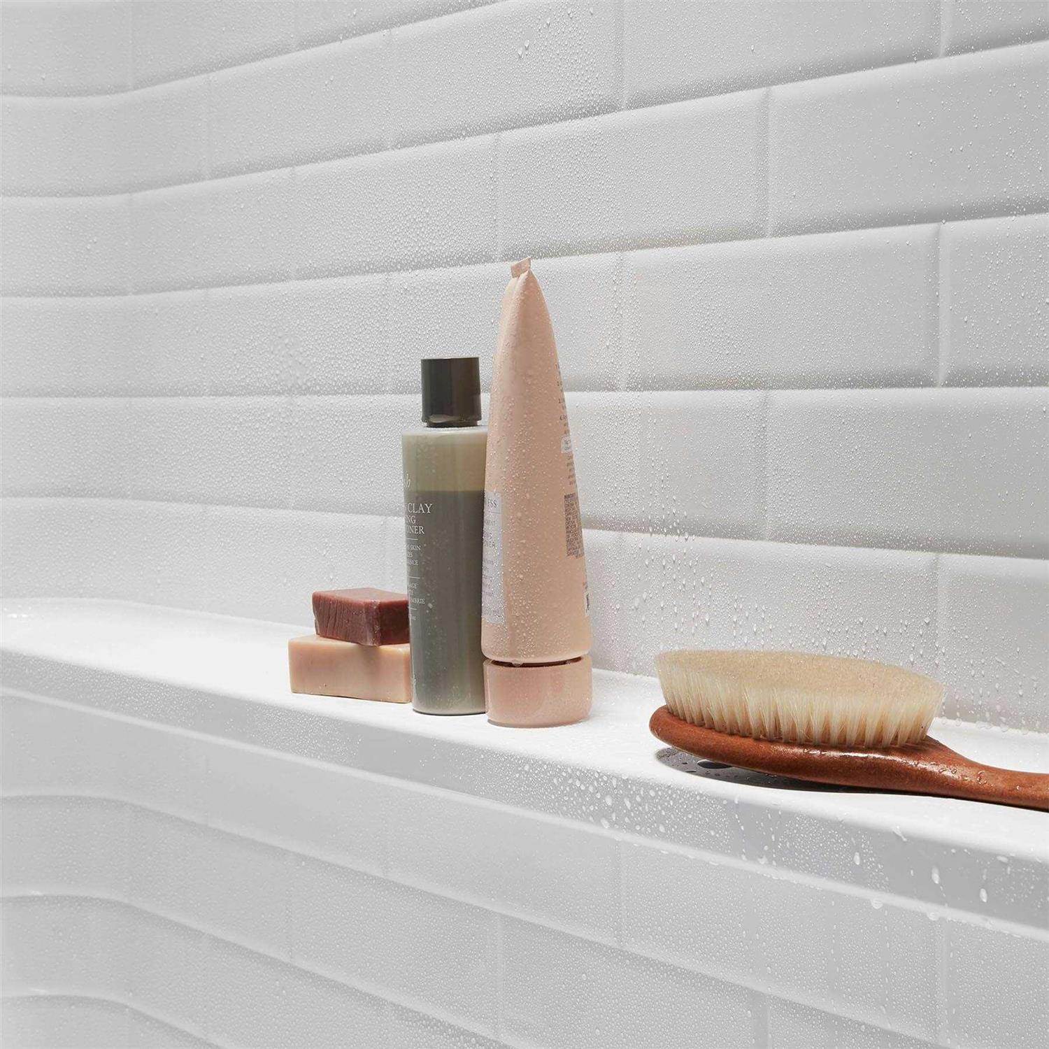 Update your bathing routine with the Traverse shower wall set. Featuring a contemporary subway tile design with a sleek shelf, it has ample storage space for your shampoo bottles. Built of solid Vikrell for material strength, durability and lasting beauty, it features a durable, smooth, high-gloss finish that’s easy to clean. Tongue-and-groove modular design allows for easy installation during any phase of construction.