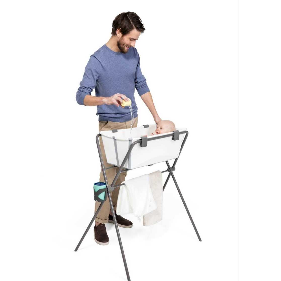 The Stokke Flexi Bath Stand is designed to bring you and your baby closer for bath time bonding and fun. Made exclusively to fit the Stokke Flexi Bath; its designed for safety ease of storage and convenience with everything close at hand. Can be used for bathing newborns and right up until they can stand unaided. Avoid backache from kneeling on the floor with this sturdy ergonomic bath time helper. Made with functionality comfort and bonding at the core of its design.