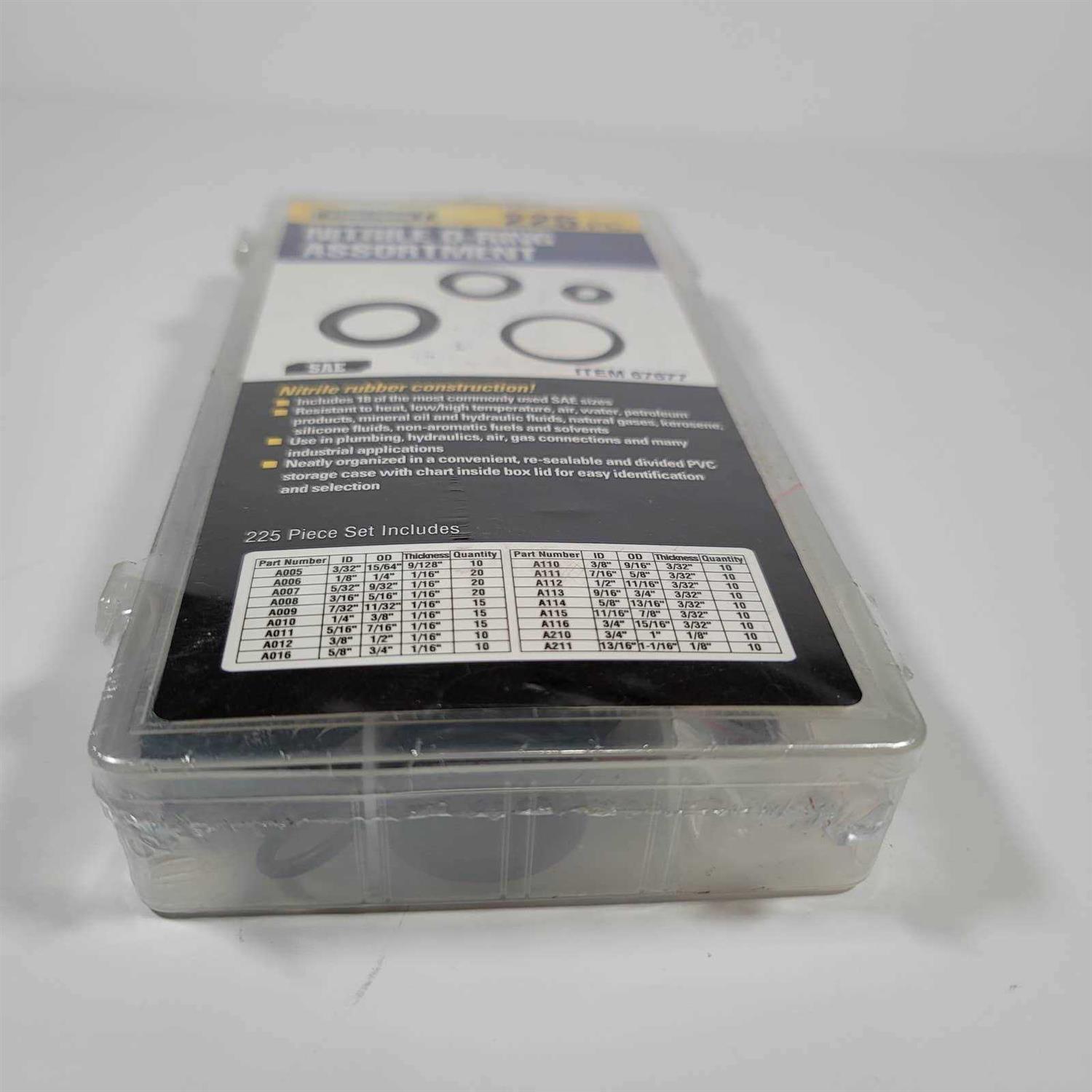 This handy assortment of O-rings includes 18 of the most commonly used SAE sizes to accommodate a wide variety of applications! The nitrile O-rings are resistant to heat, high/low temperature, air, water, petroleum products, mineral oil and hydraulic fluids, natural gases, kerosene, silicon fluids, non-aromatic fuels and solvents. Great for plumbing, hydraulics, air, gas connections and man industrial applications, this set of O-rings comes neatly organized in a PVC storage case for easy portability to any job!