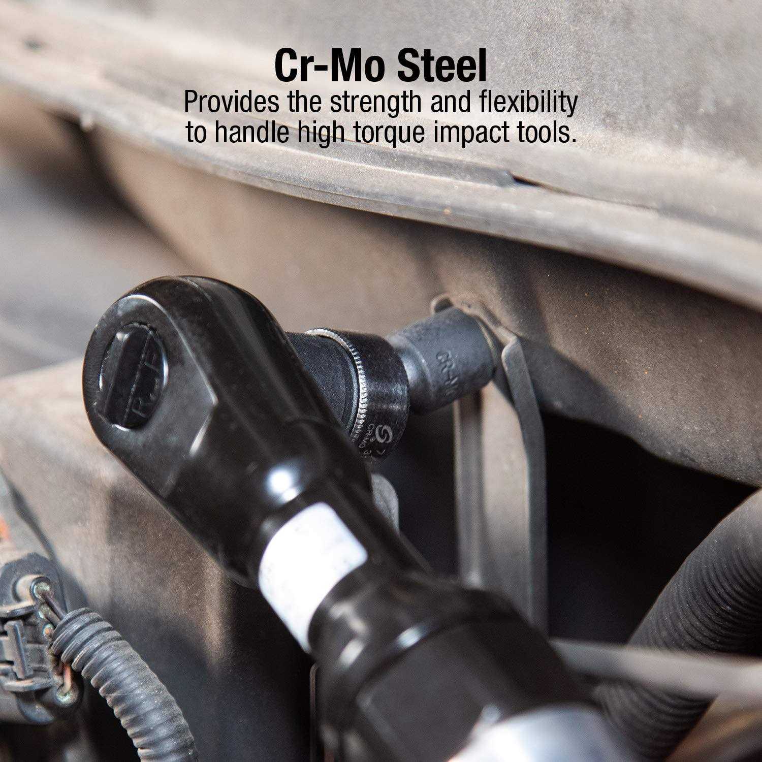 - CR-MO STEEL: Provides the strength and flexibility to handle high torque impact tools.