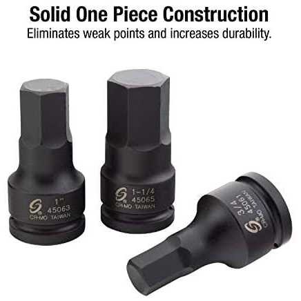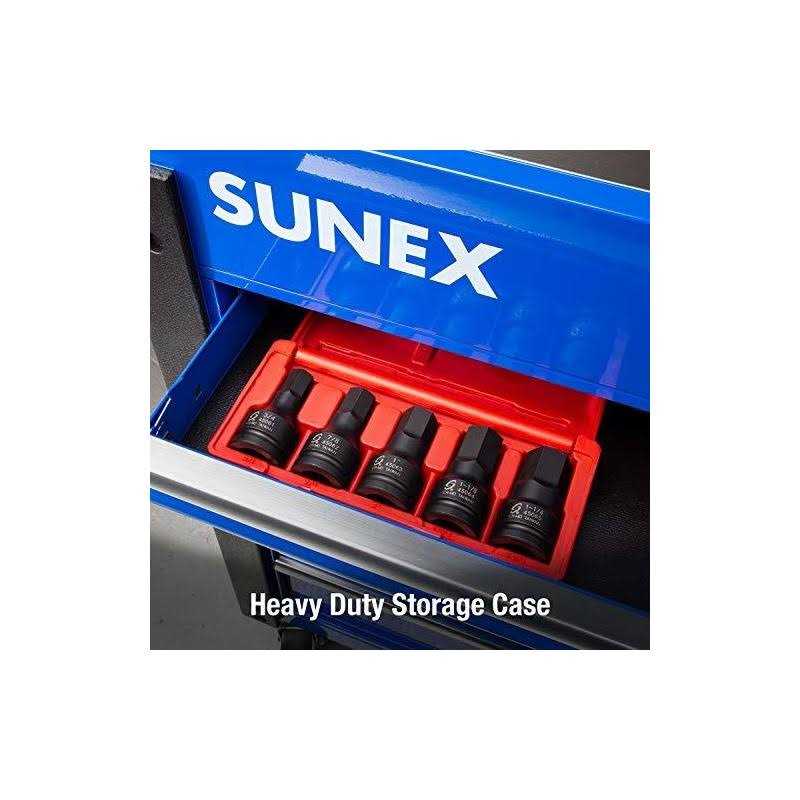 Drive, Storage Case, Kit – Sunex Tools hex drive impact sockets are offered as sets or individually in several SAE and metric sizes. Stubby design hex bits are also available to fit into tight areas. Each socket is machined from CR-MO alloy steel and finished with black oxide for long life. Order the style, size, and quantity needed for your toolbox; multi-piece sets include a heavy-duty storage case.