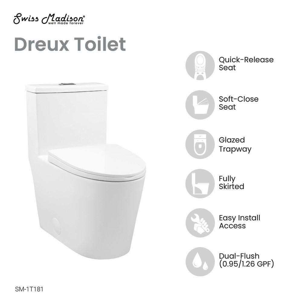- Create a stylish look to your toilet by using this Swiss Madison Dreux Dual Flush Elongated Toilet in Glossy White Seat Included.