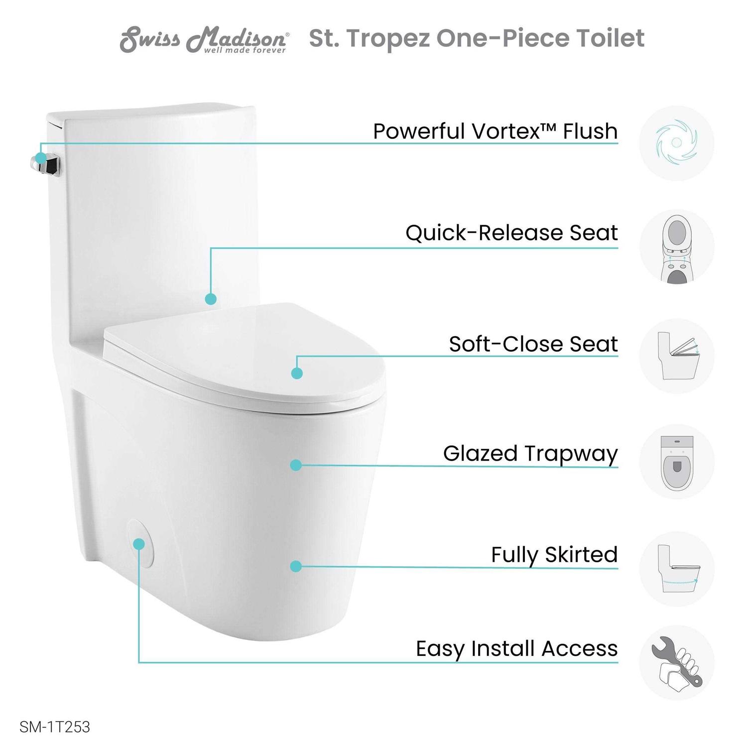The St. Tropez One-Piece Elongated Toilet offers a seamless design with a fully skirted bowl creating a modern design for any bathroom. The left side single flush handle offers consistent flushing power without compromising performance. Its left side single flush handle and Vortex flush technology uses powerful dual nozzles to keep your bowl cleaner than standard rim holes.