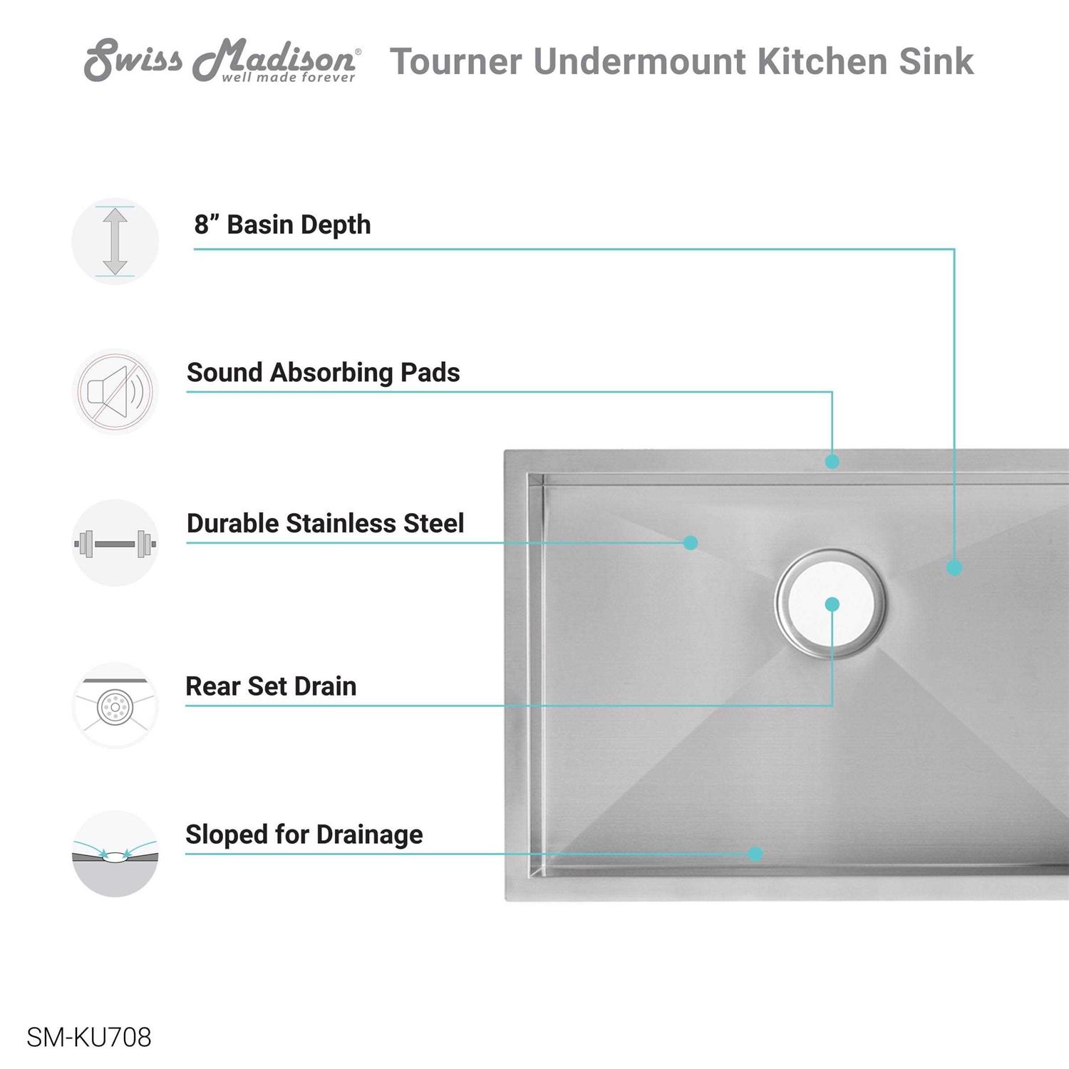 The Tourner Undermount Kitchen Sink is a stylish single basin sink with numerous finish options making it a perfect addition to any kitchen setting. Built with corrosion rust and scratch-resistant stainless steel this sleek and modern sink was built to withstand heavy use and high temperatures. Additionally, the sink has a deep spacious bowl allowing for uninterrupted washing.