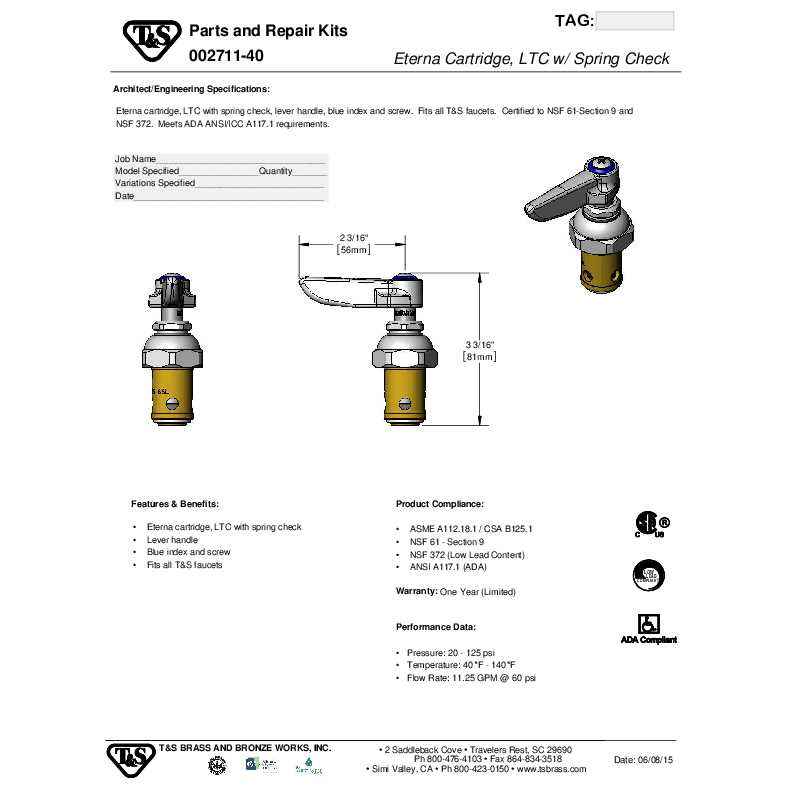 Upgrade your plumbing system with the T&S Brass 002711-40M Eterna Cartridge Assembly. Crafted with precision and built to last, this cartridge assembly ensures smooth operation and reliable performance. The spring check feature prevents any backflow, ensuring a consistent flow of water. With its left-hand design, 2-3/16″ long lever handle, and blue index, this assembly is not only functional but also aesthetically pleasing. Meeting ADA, ASME, and NSF standards, it guarantees safe usage. Each pack includes 2 cartridge assemblies, making it a cost-effective choice. Trust in T&S Brass for quality and reliability.