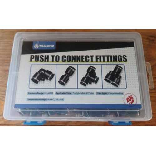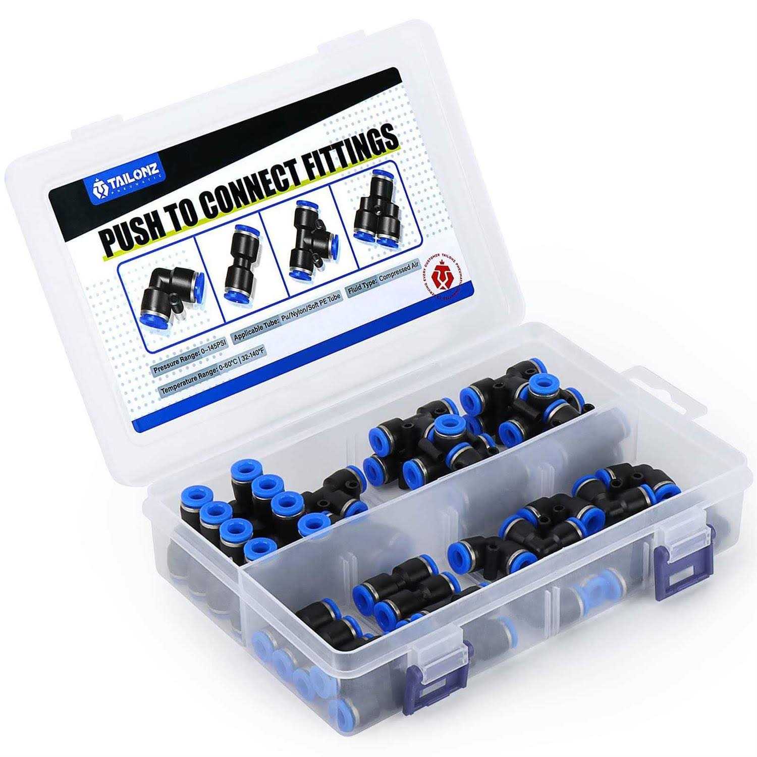 TAILONZ Pneumatic 1/4 inch OD Push to Connect Fittings Pneumatic Fittings Kit 10 Spliters+10 Elbows+10 tee+10 Straight (40 Pcs)