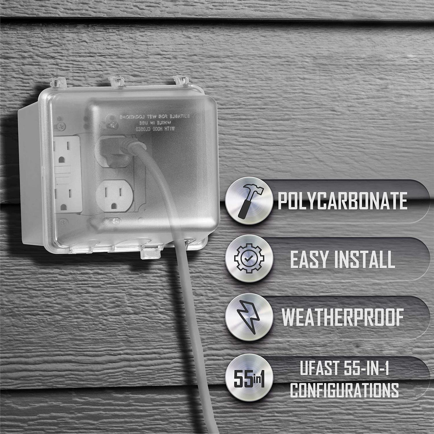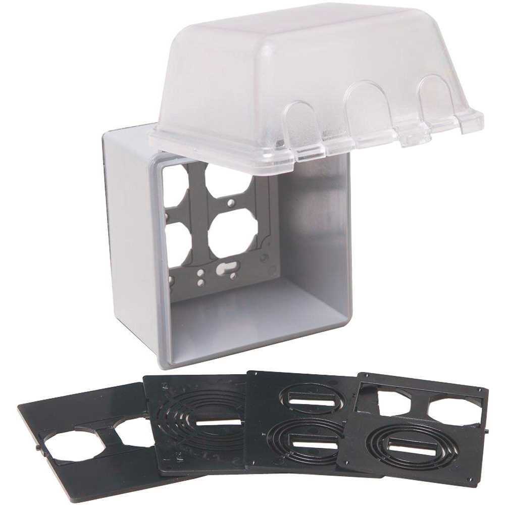 2-Gang Weatherproof In-Use Cover, 55-in-1, 4-3/4 in. Deep, Clear High-impact polycarbonate construction provides maximum durability Patented Quick-Fit keyhole mounting system allows installation in under a minute Patented Universal Fit Adapter System Technology (U-Fast) for 55-in-1 custom device configurations, comes pre-configured for GFCI Includes attached gasket and mounting hardware.